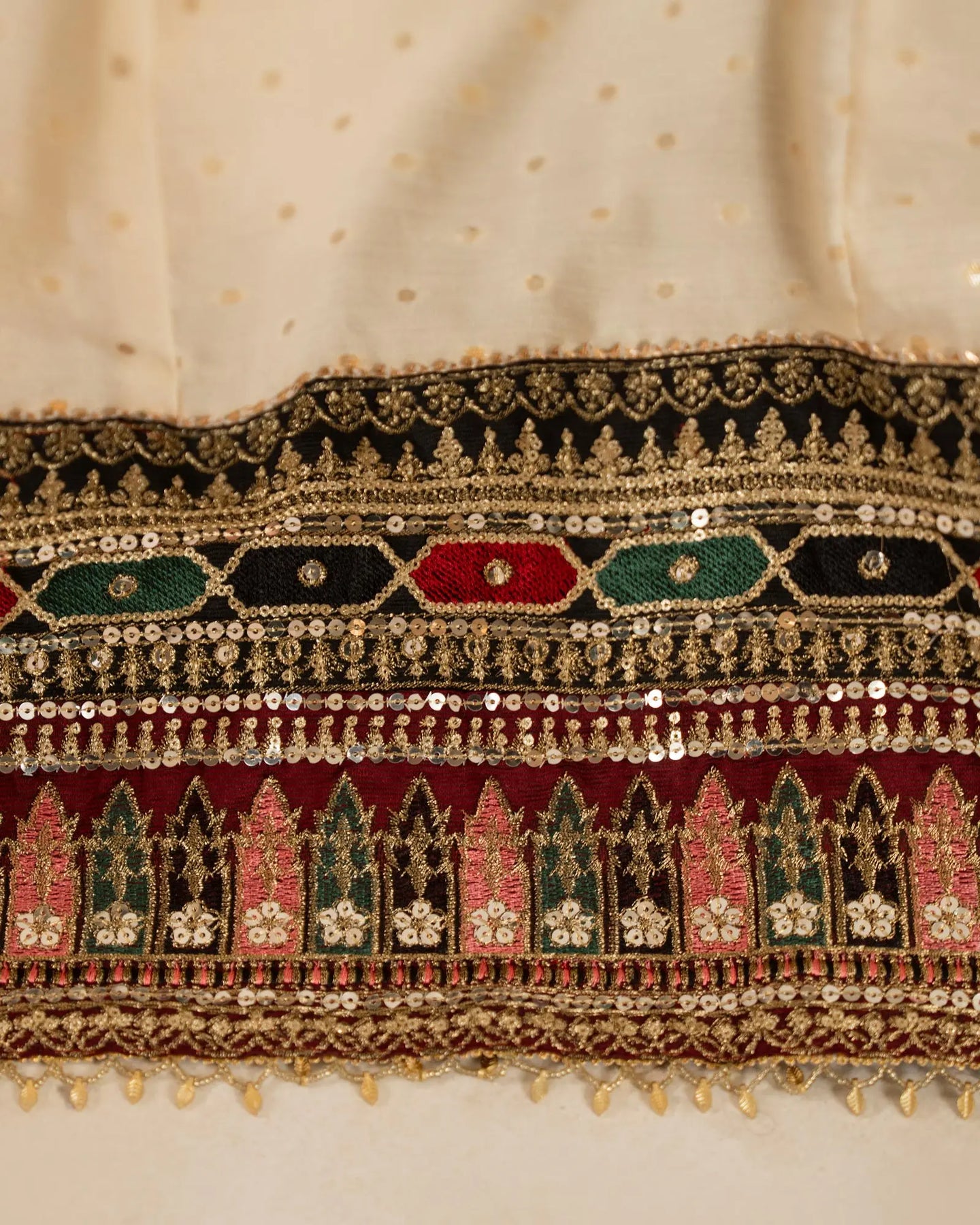 This Mughal tradition chic-style frock is a showstopper in this wedding season. A fully floor-drape style frock features a boat neckline with minimal adda work, heavy border lace on the hem, and sleeves embellished with sequence, tilla, and beadwork coupled with plain pants and topped with a contrasting red dupatta with heavy border. This classy attire gives you a fully royal look.