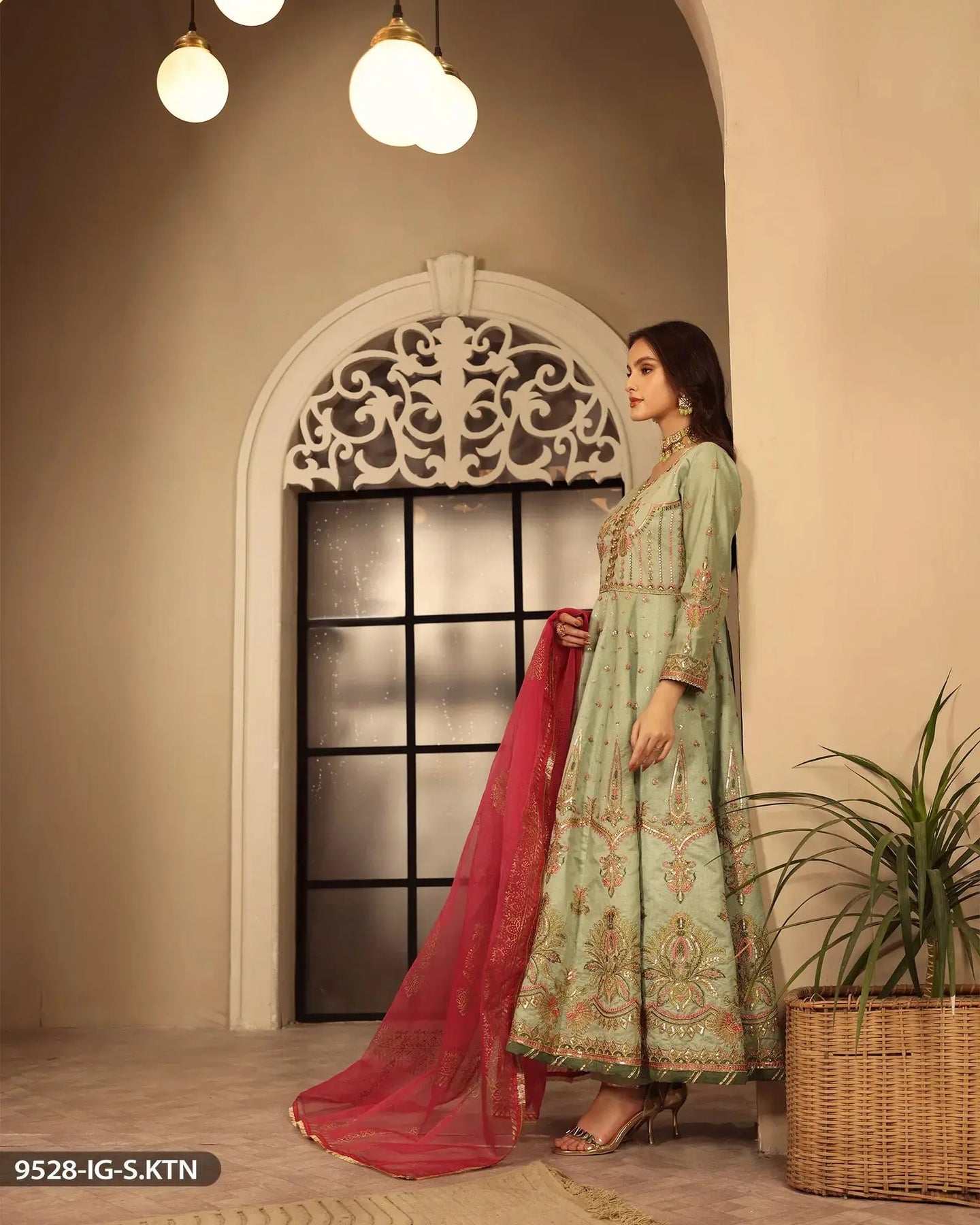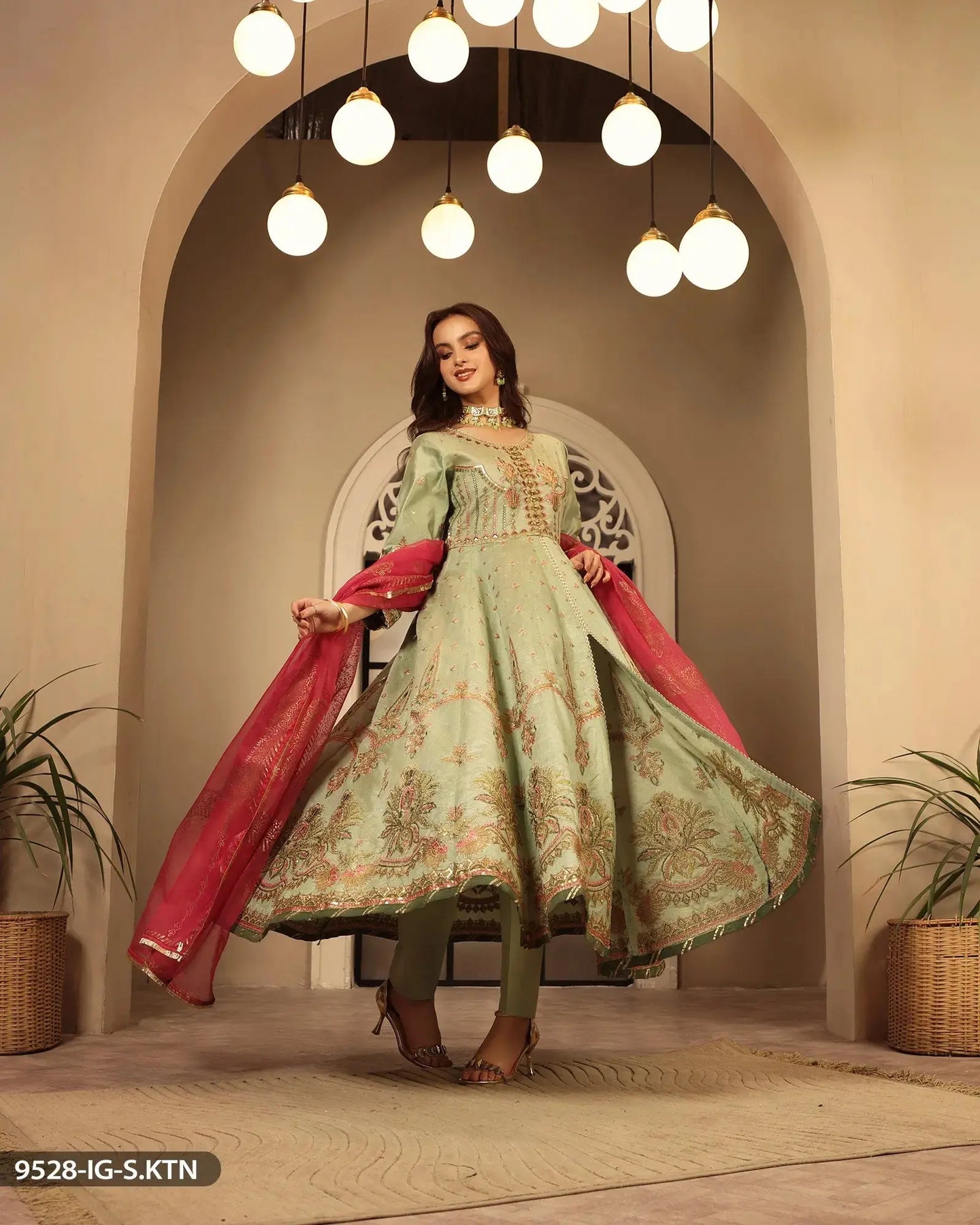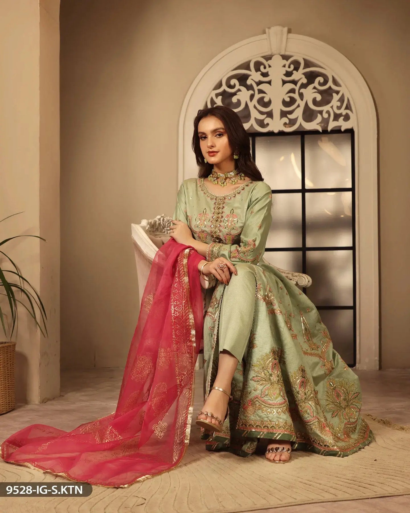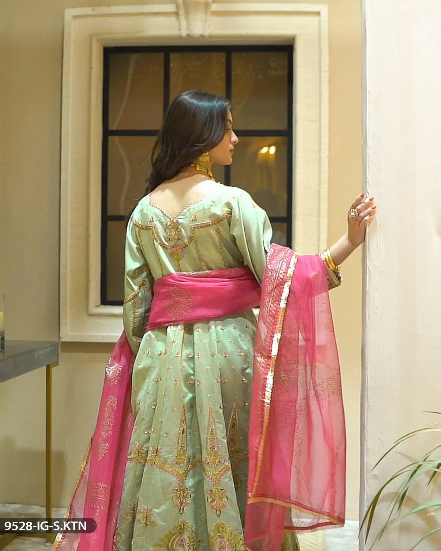 Embrace your inner trendsetter with this Pista hued three piece ensemble that will truly make you stand out from the rest. The maxi style chambray katan shirt is intricately and generously worked with tilla embroidery and donned with sequences, beads and gota work. Paired with a chambray katan trouser and a ravishing organza dupatta this look is serving sophisticated fashion.