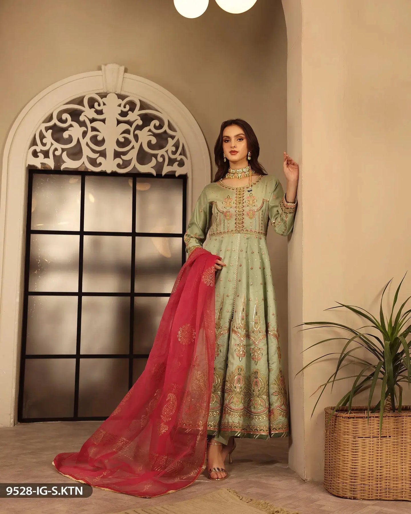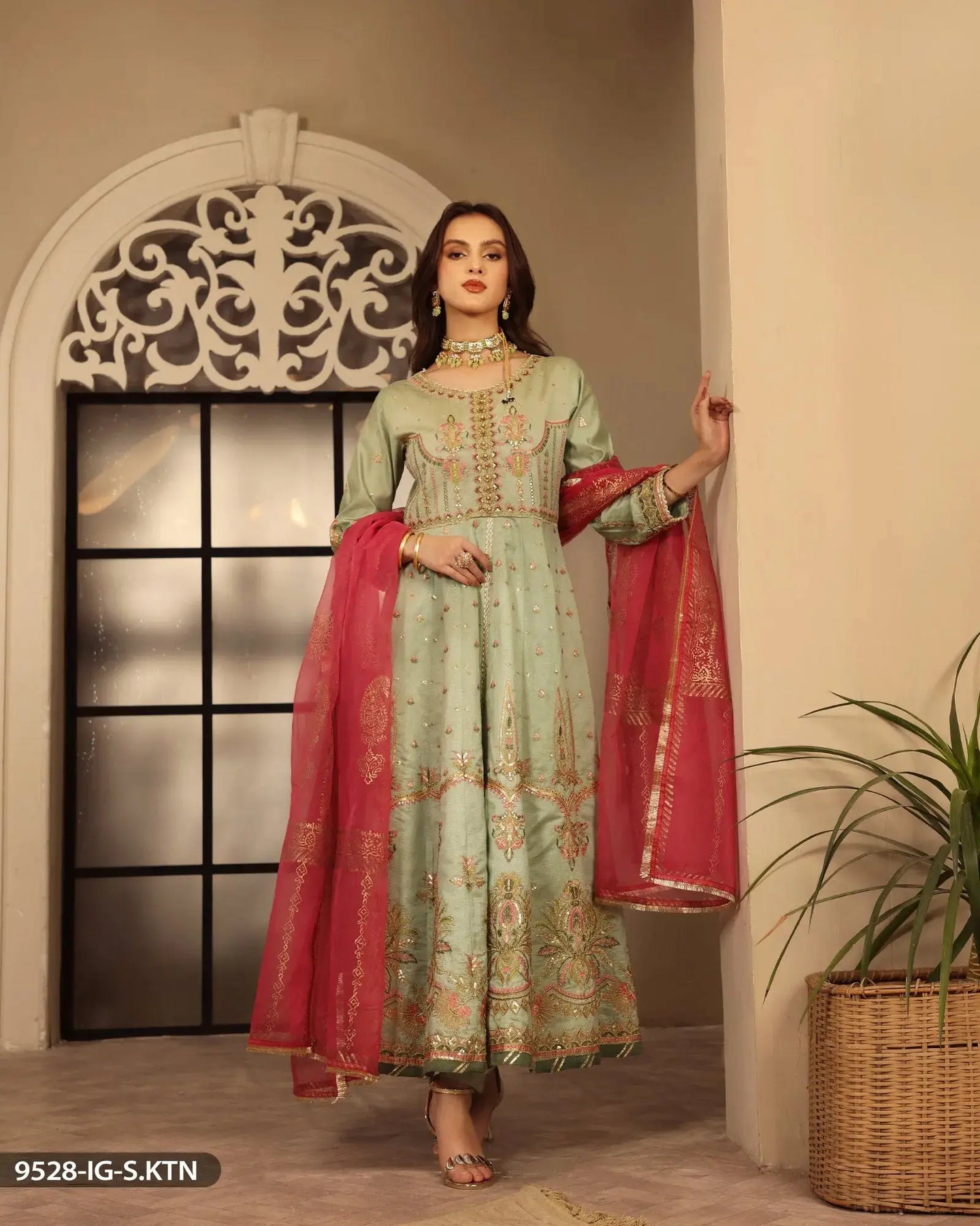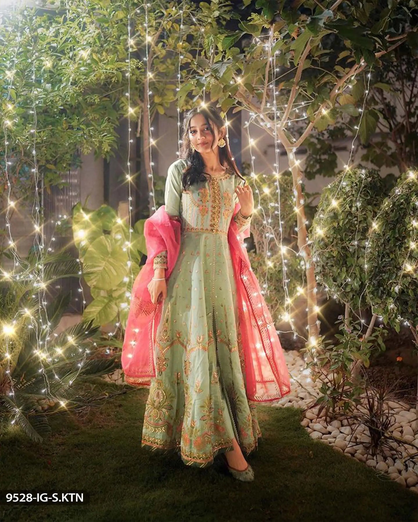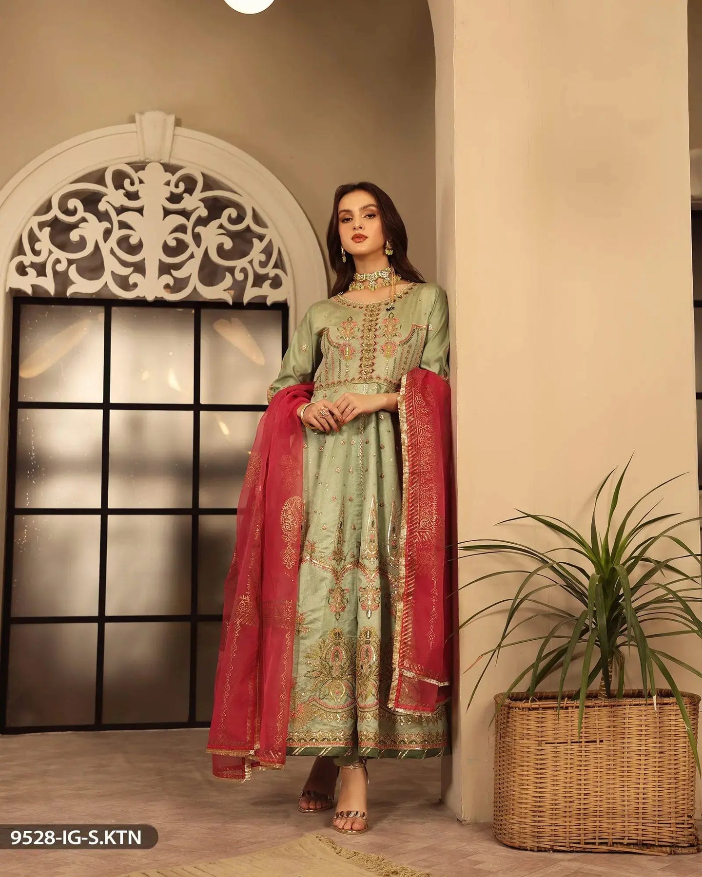 Embrace your inner trendsetter with this Pista hued three piece ensemble that will truly make you stand out from the rest. The maxi style chambray katan shirt is intricately and generously worked with tilla embroidery and donned with sequences, beads and gota work. Paired with a chambray katan trouser and a ravishing organza dupatta this look is serving sophisticated fashion.