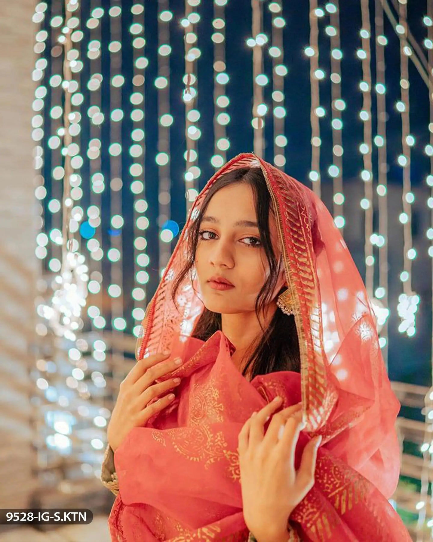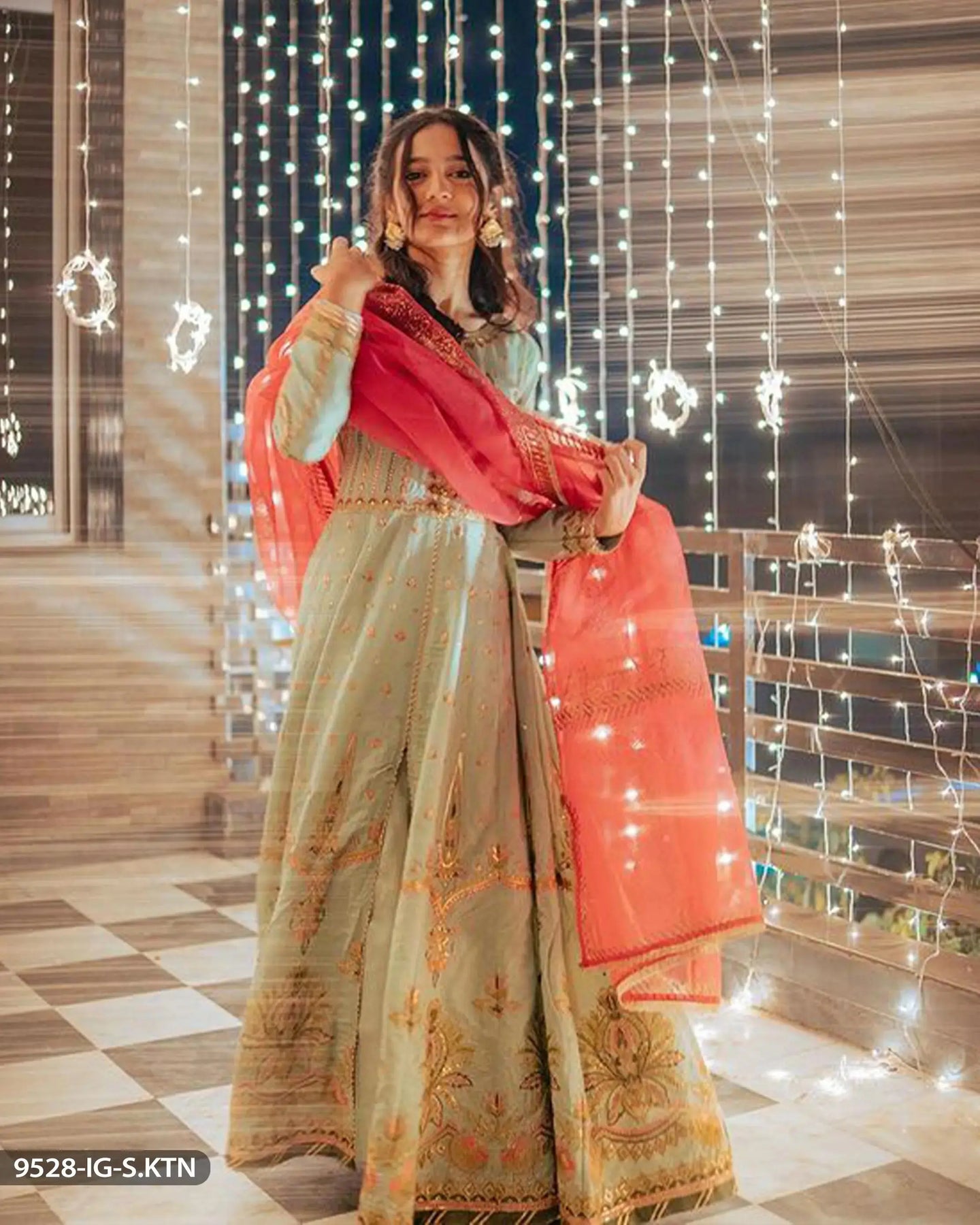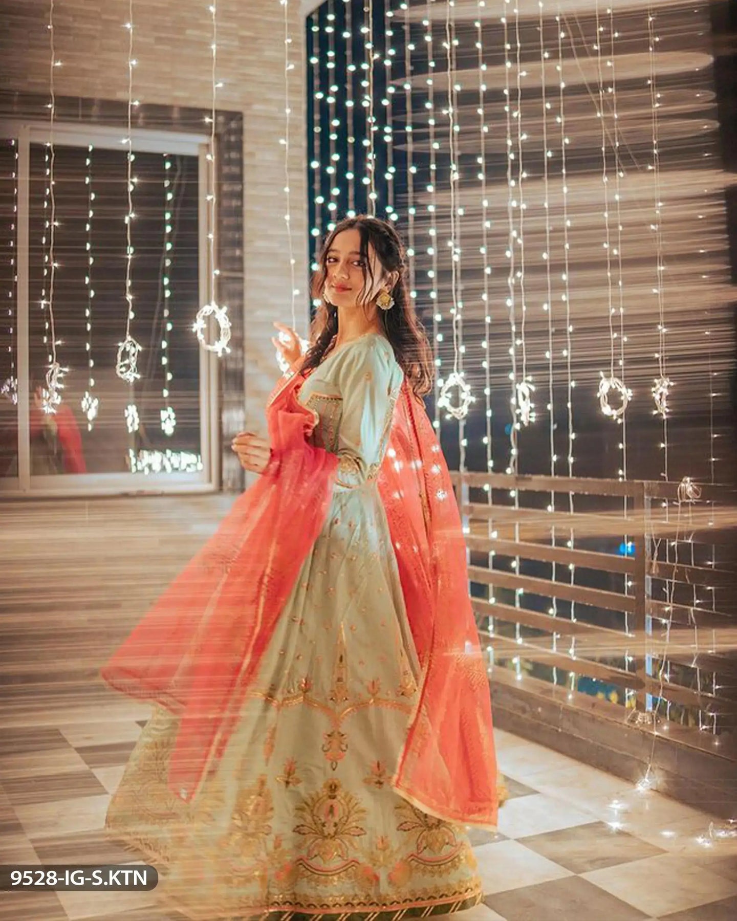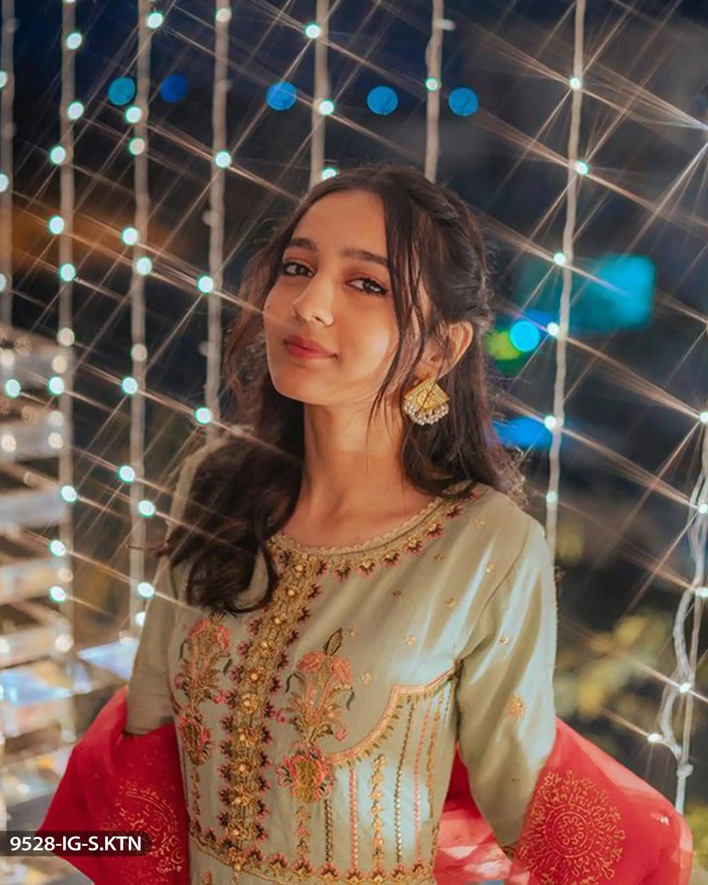 Embrace your inner trendsetter with this Pista hued three piece ensemble that will truly make you stand out from the rest. The maxi style chambray katan shirt is intricately and generously worked with tilla embroidery and donned with sequences, beads and gota work. Paired with a chambray katan trouser and a ravishing organza dupatta this look is serving sophisticated fashion.