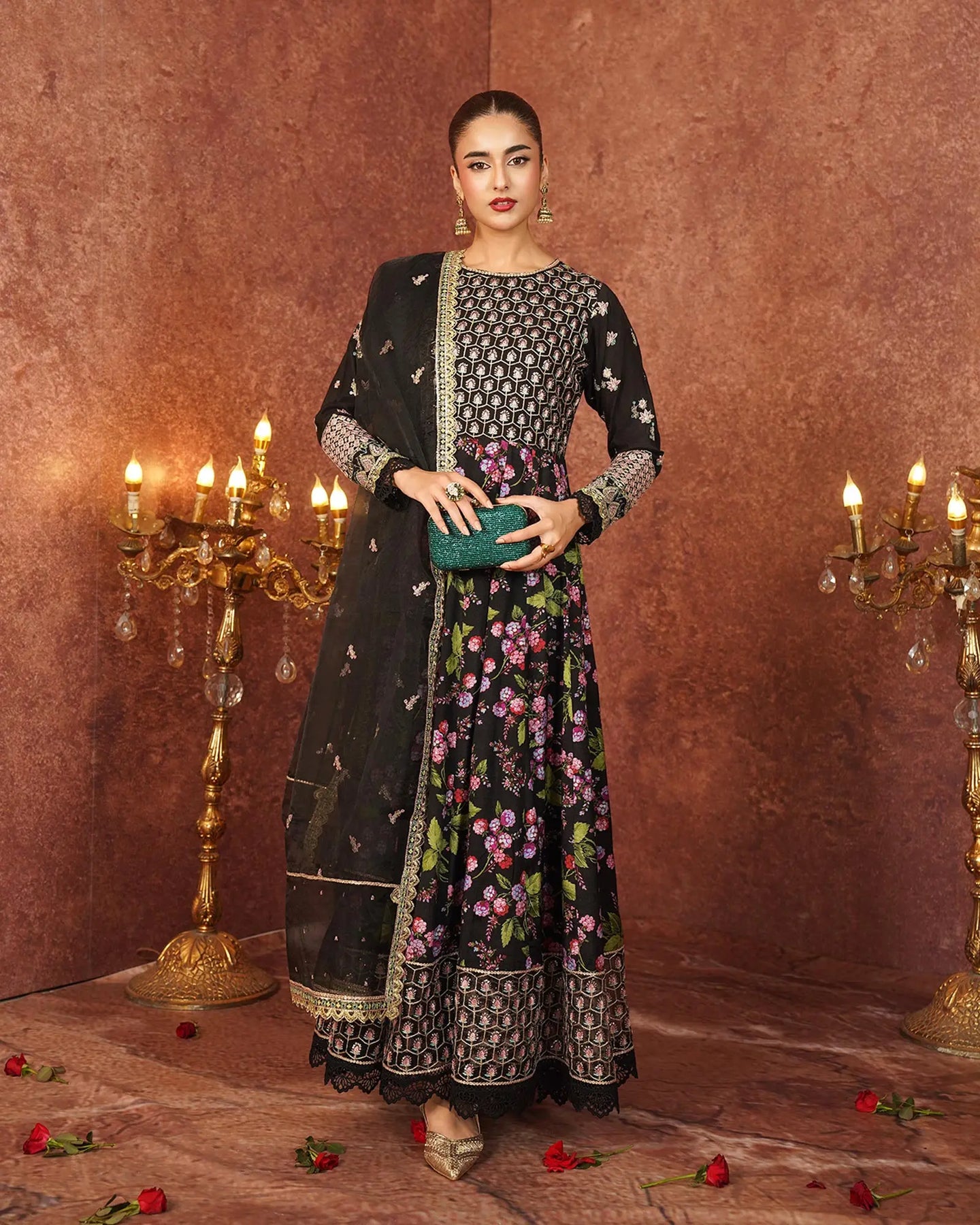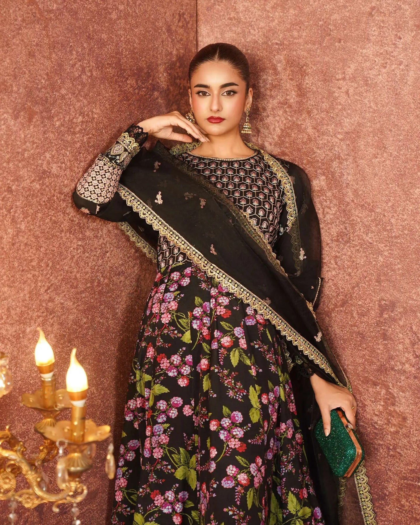 Crafted for special occasions, this paper katan 3-piece dress elevates your style with a long frock featuring a graceful boat neckline and refined yoke border and sleeve work. The striking work—highlighted with tilla, sequins, lace, and appliqué—adds festive brilliance. Paired with elegant trousers and a beautiful dupatta, this outfit radiates royal charm.