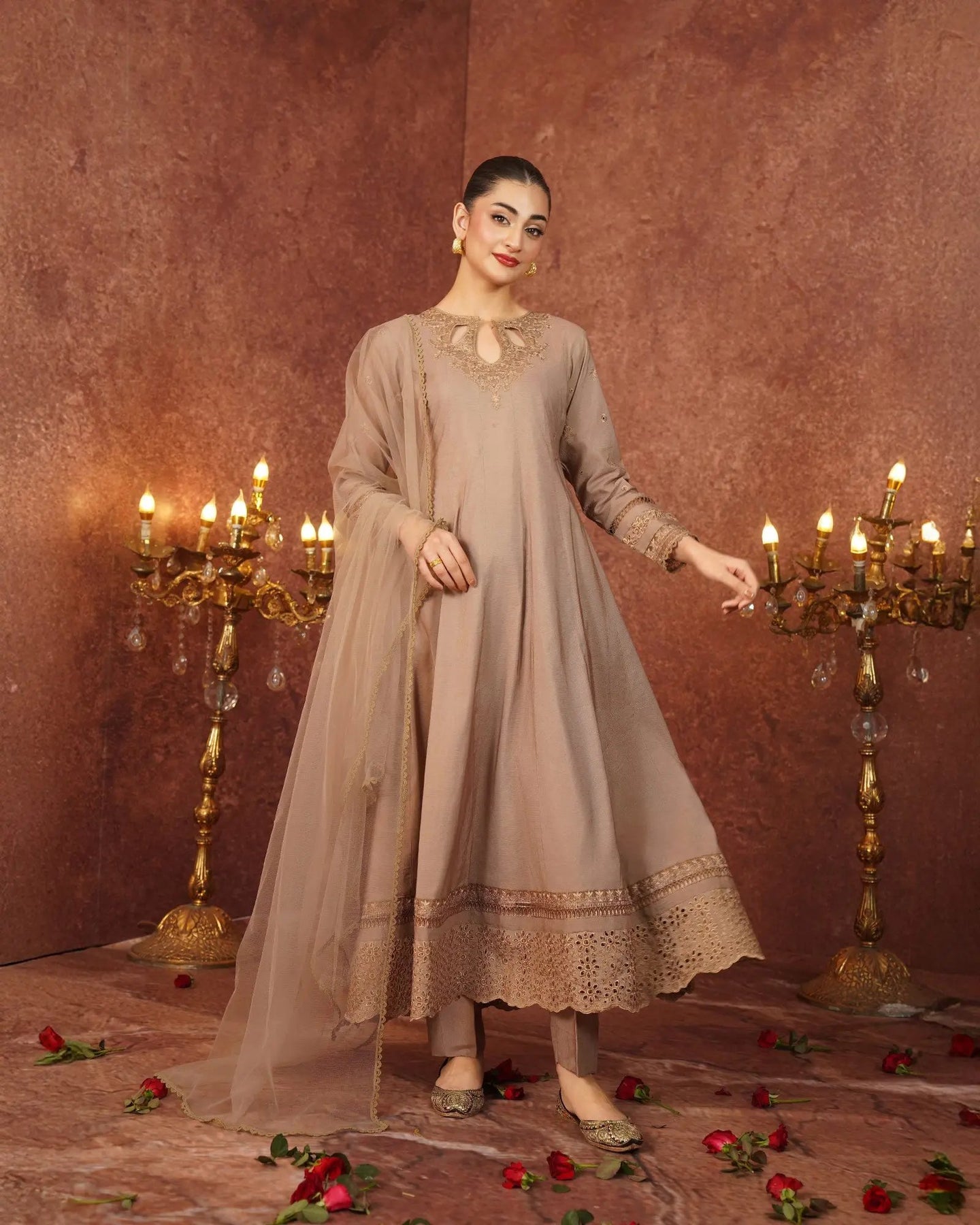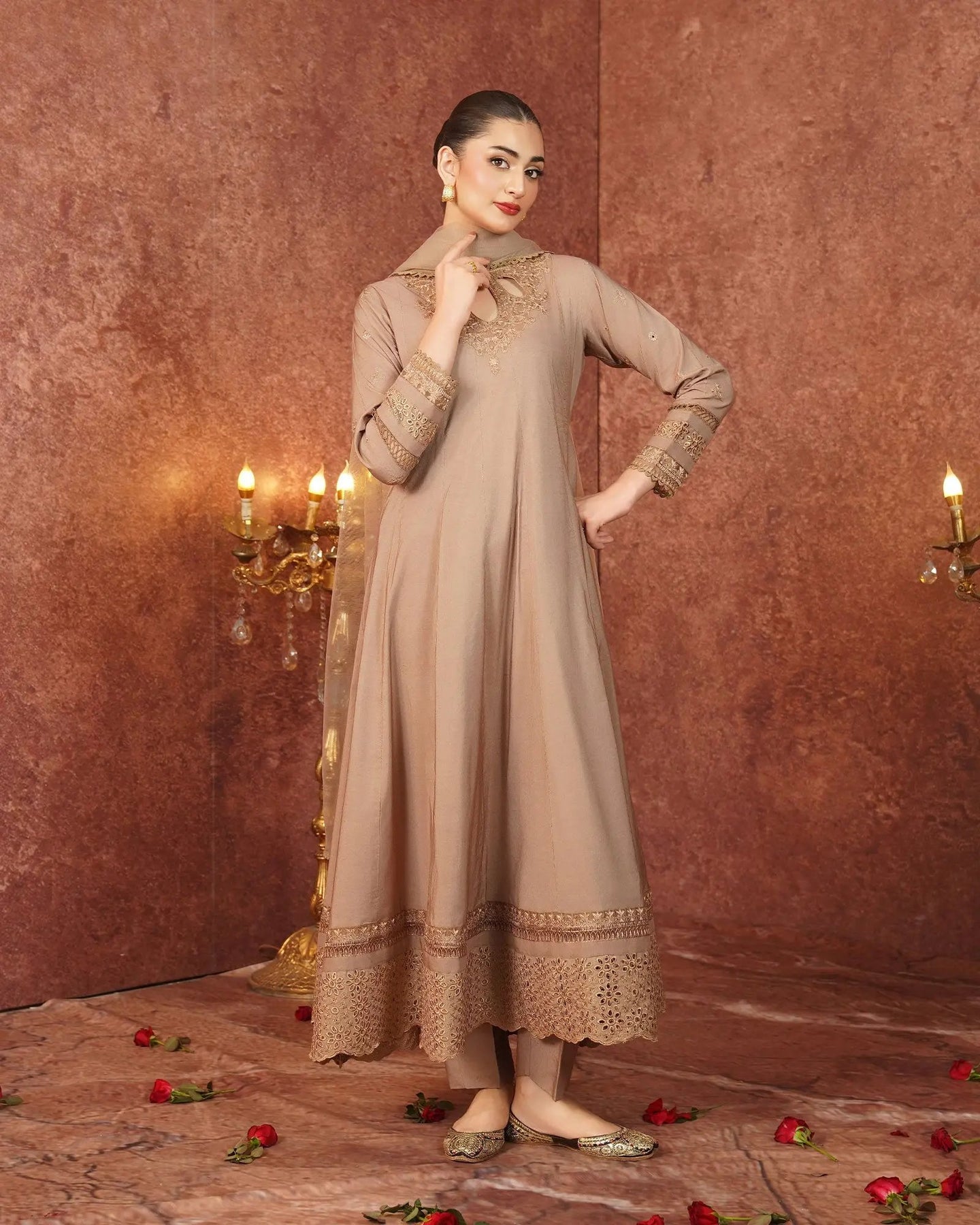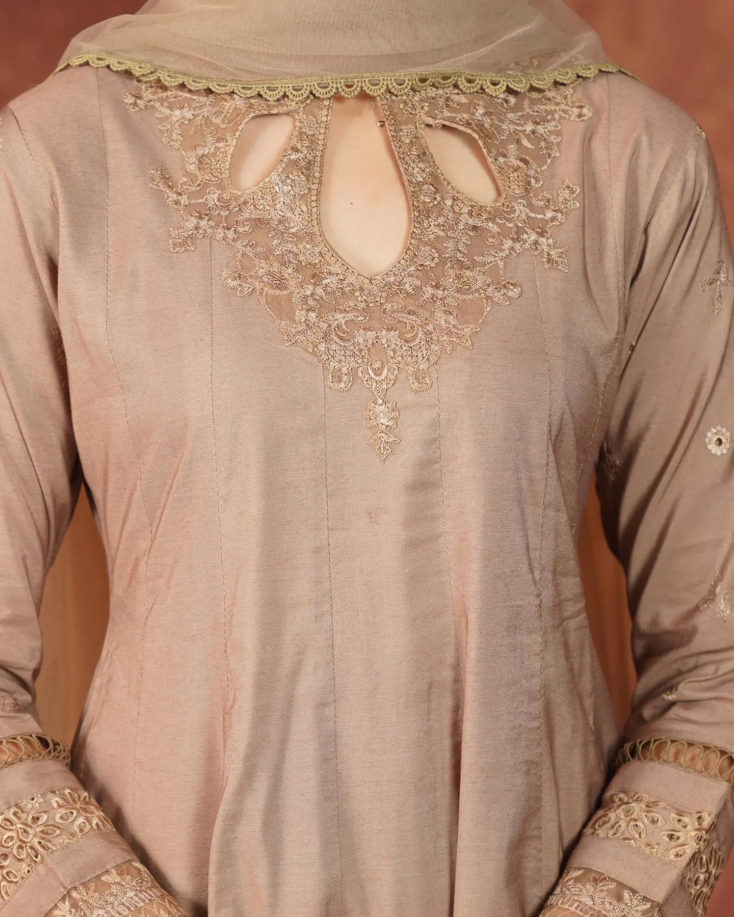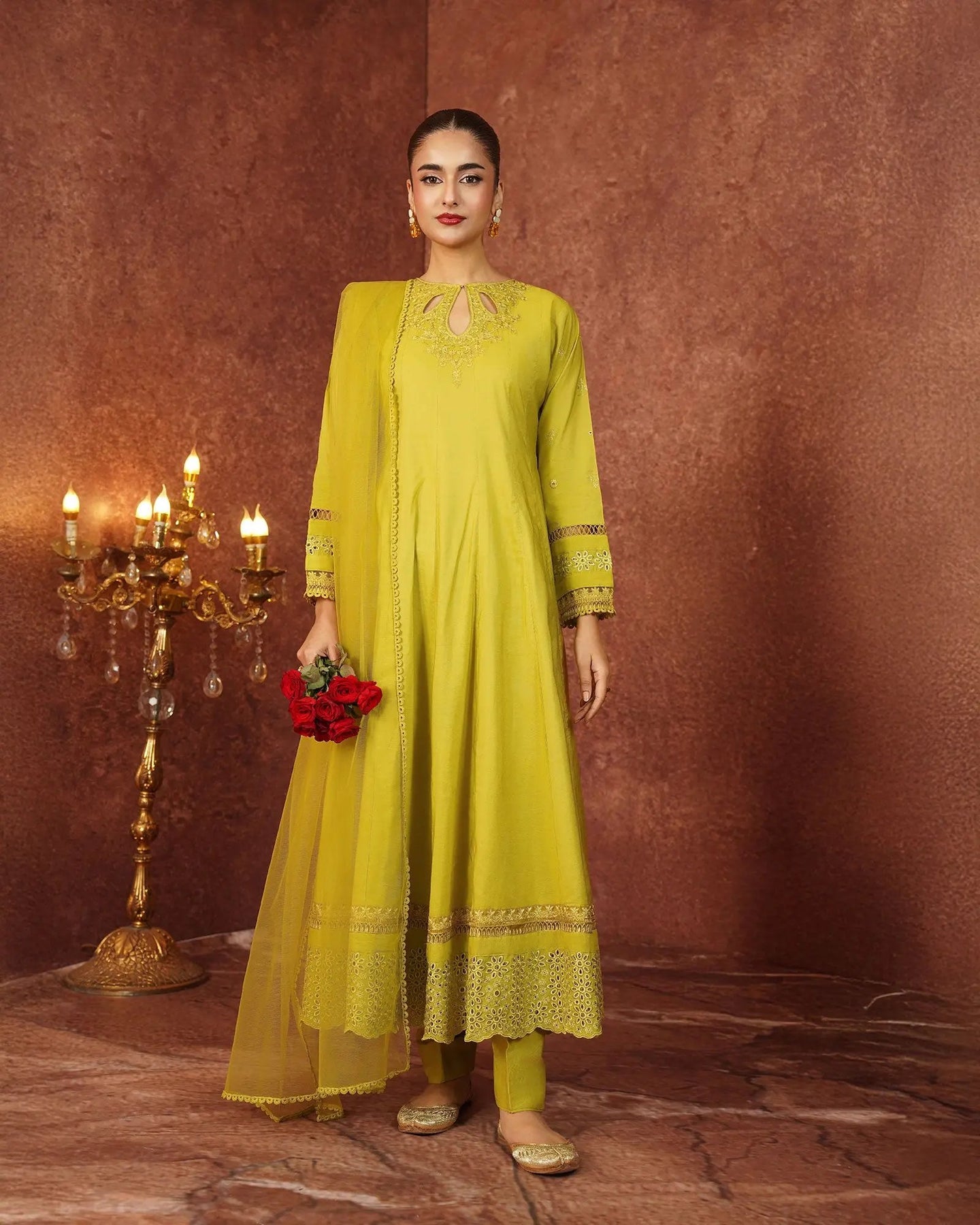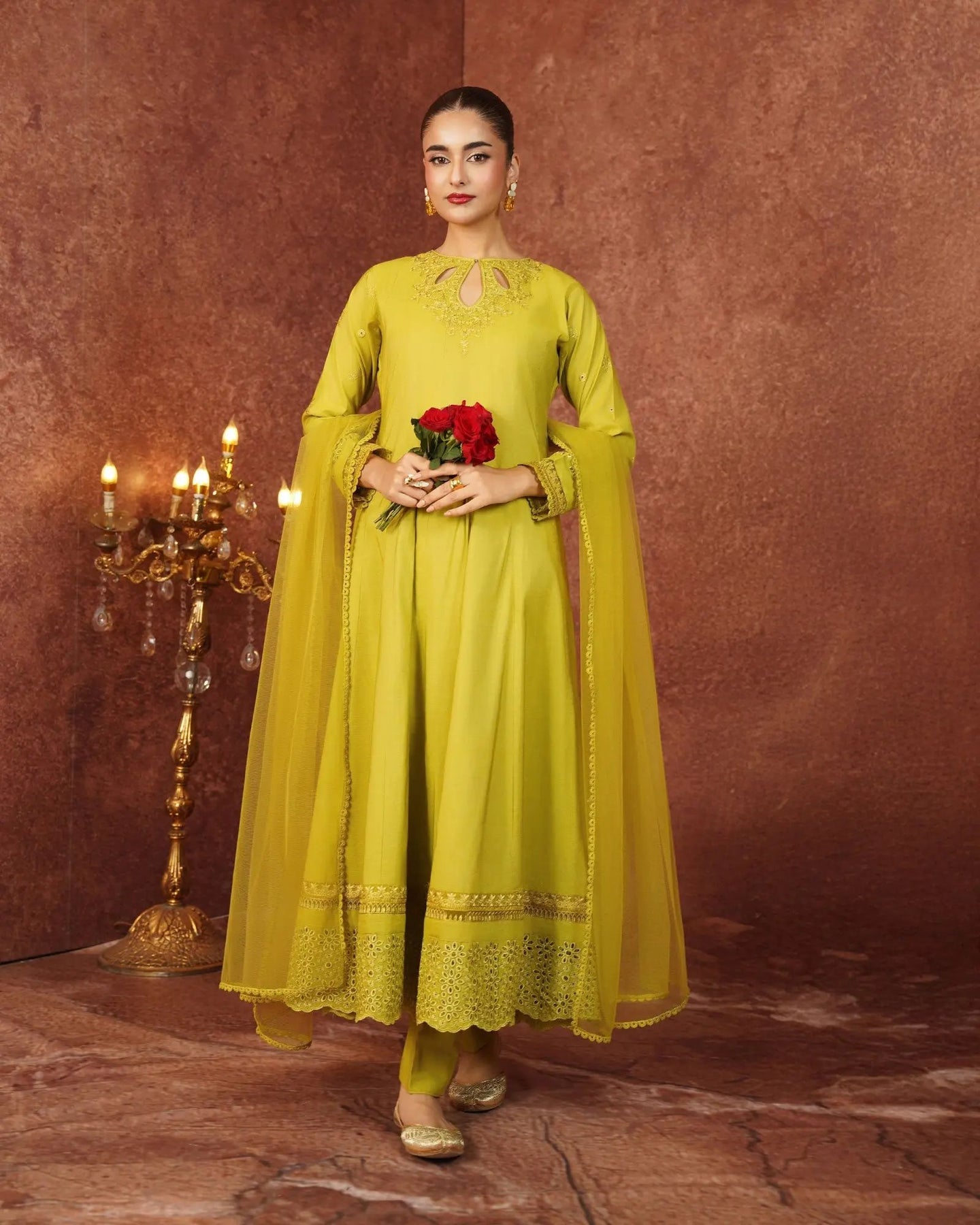 Crafted for special occasions, this paper katan 3-piece suit elevates your style with a long frock featuring a graceful keyhole neckline and refined work. The striking frock is highlighted with a chicken kari lace border, embroidered lace, and festive brilliance. Paired with elegant trousers and a dupatta, this outfit radiates royal charm.