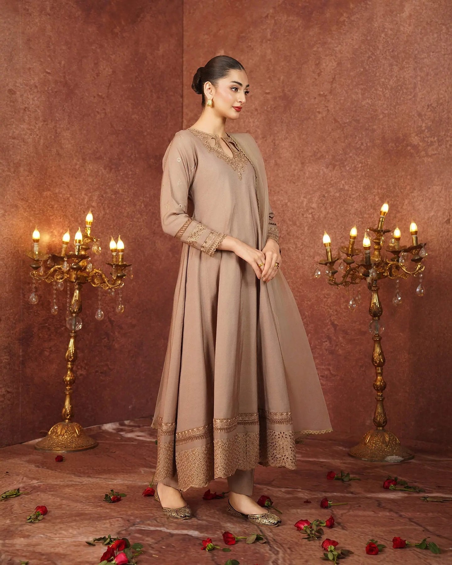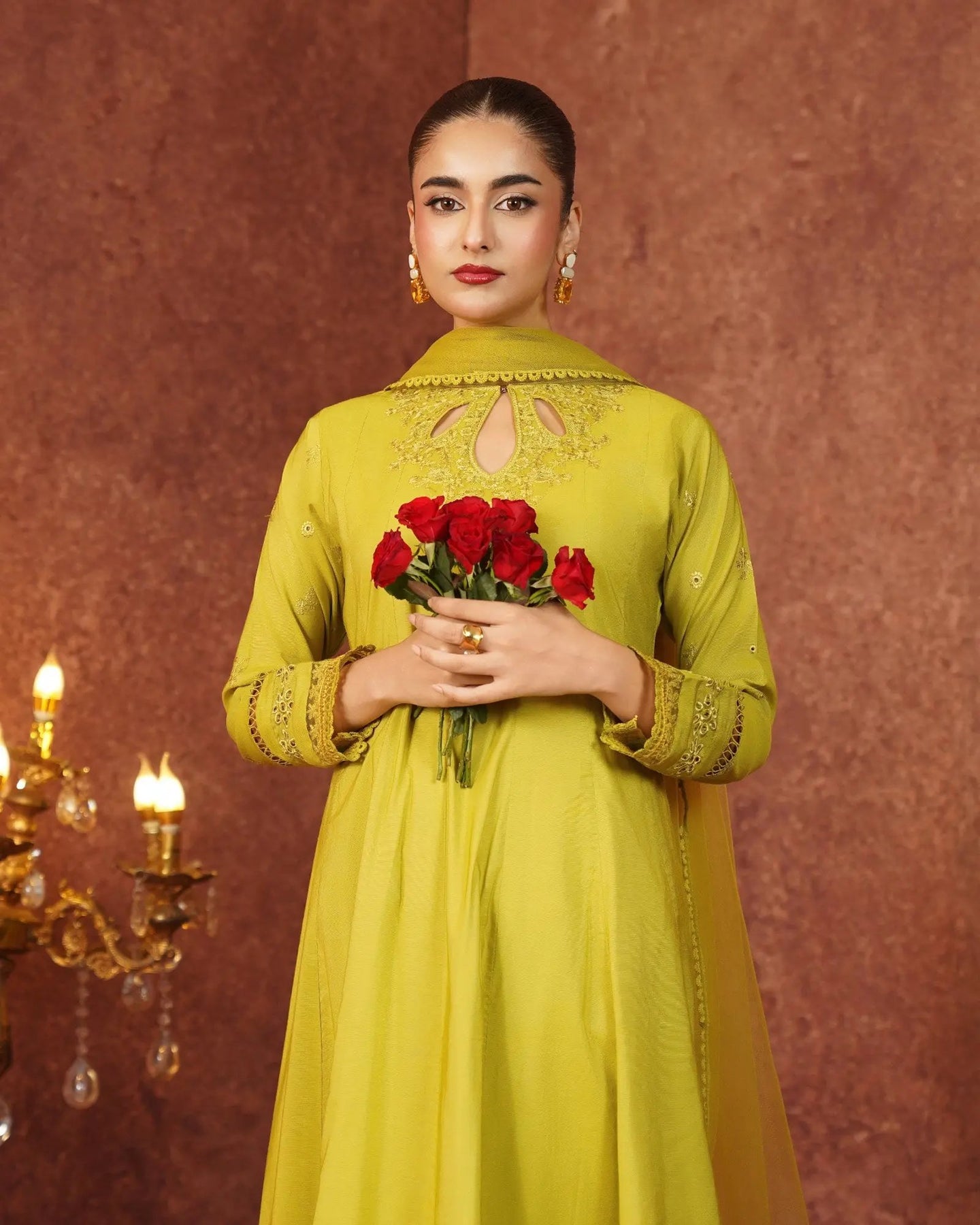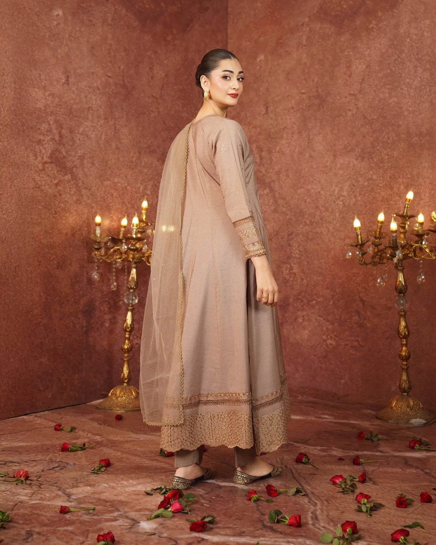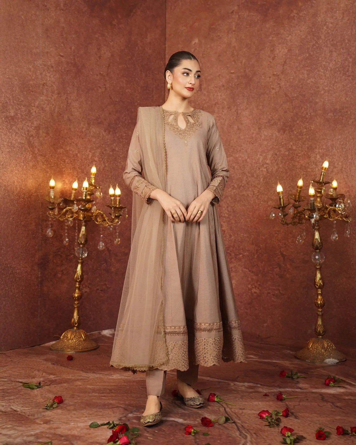 Crafted for special occasions, this paper katan 3-piece suit elevates your style with a long frock featuring a graceful keyhole neckline and refined work. The striking frock is highlighted with a chicken kari lace border, embroidered lace, and festive brilliance. Paired with elegant trousers and a dupatta, this outfit radiates royal charm.