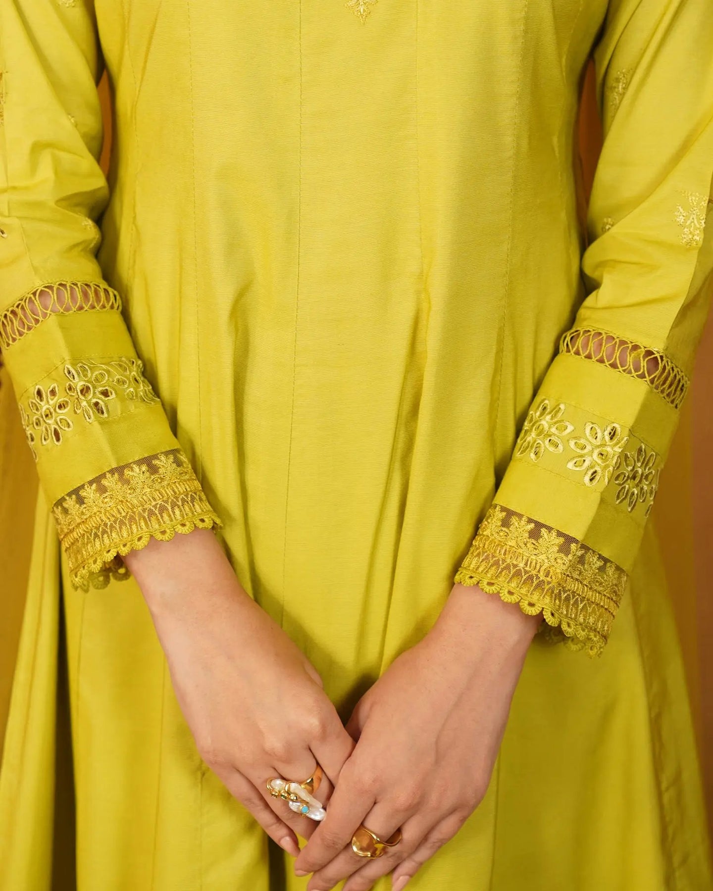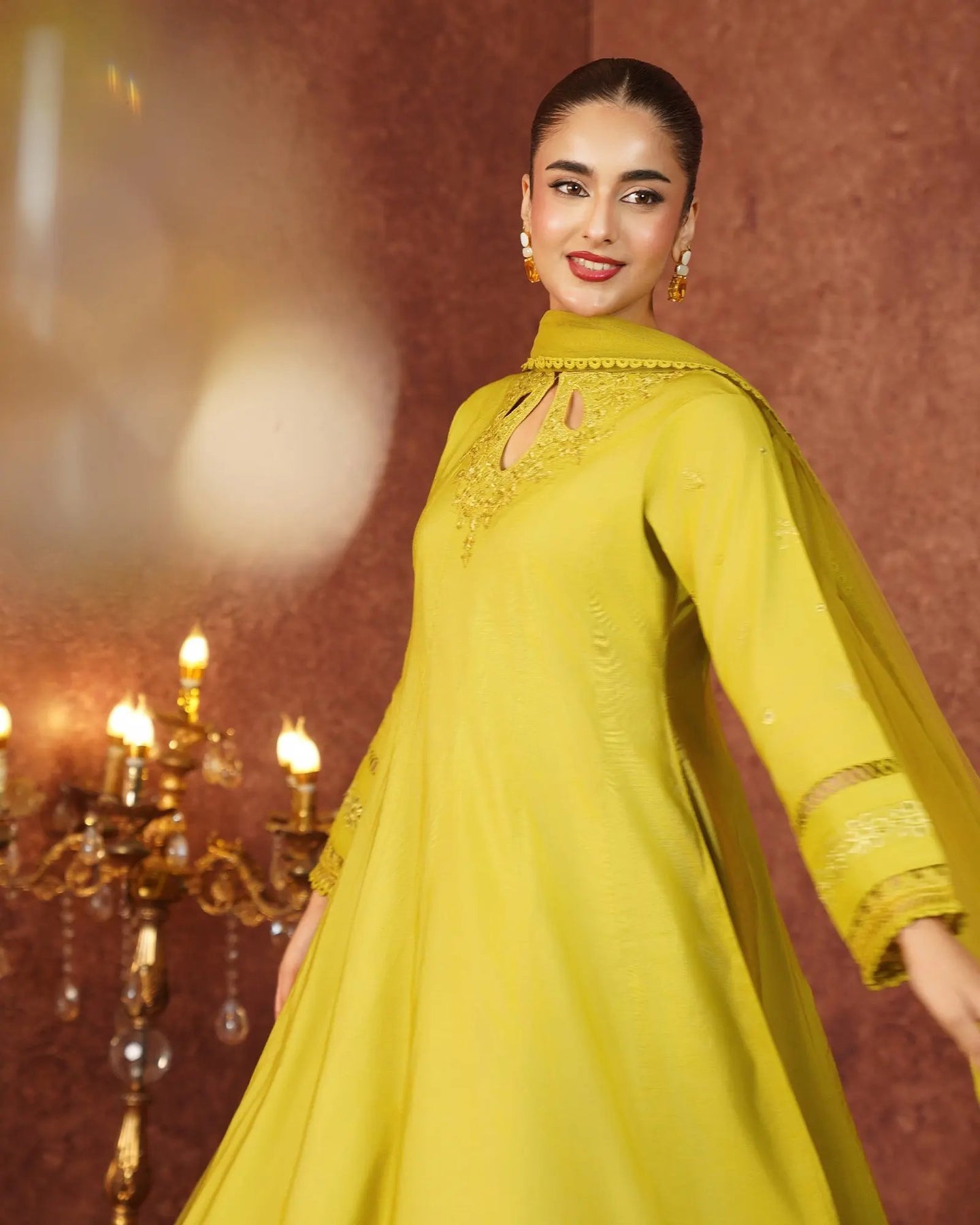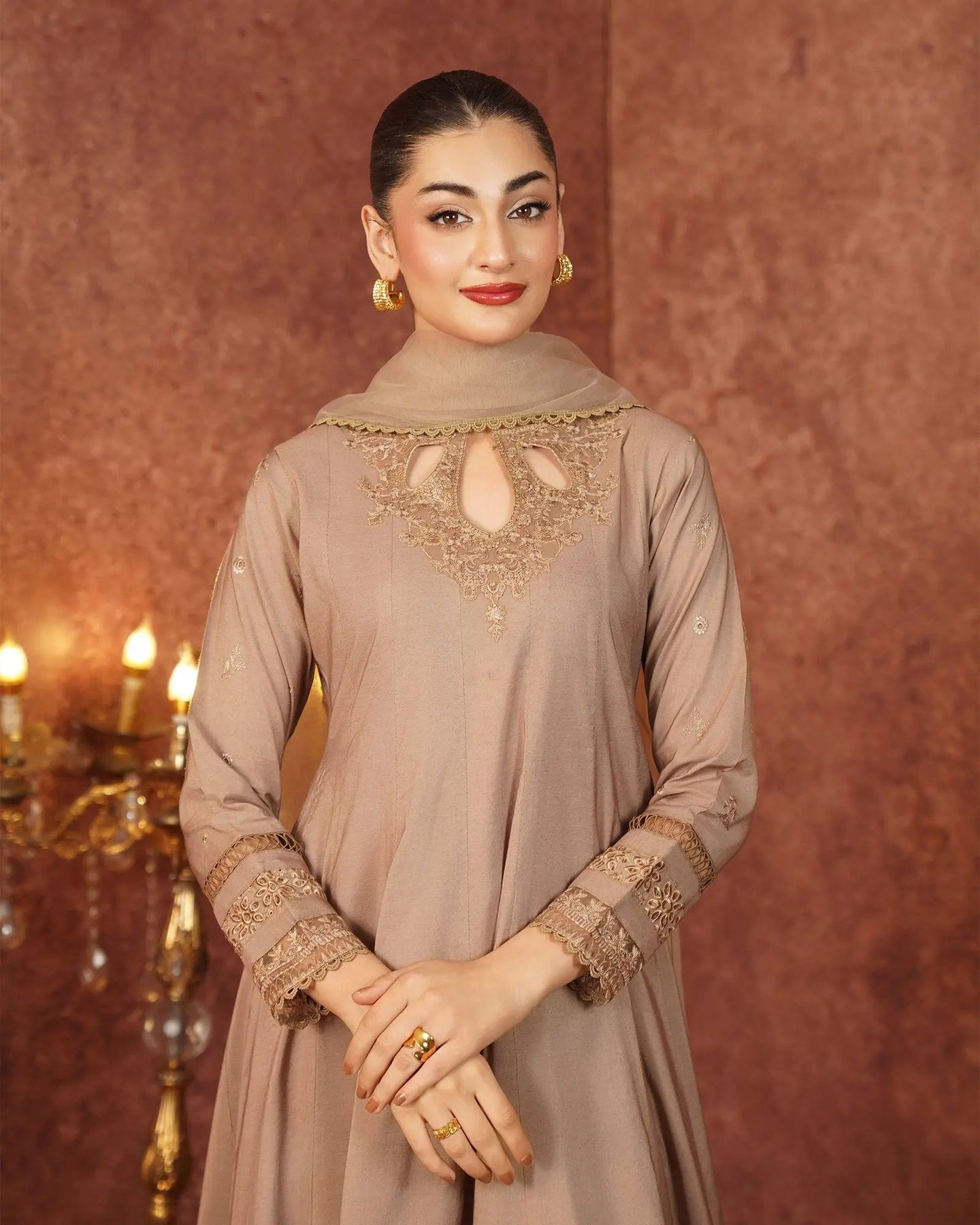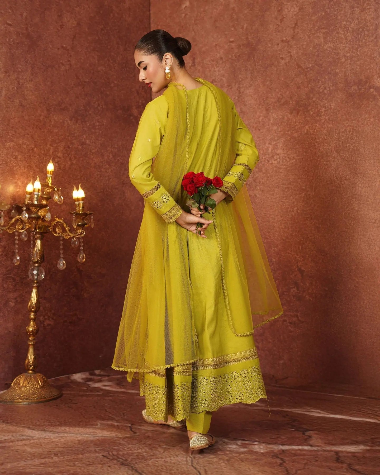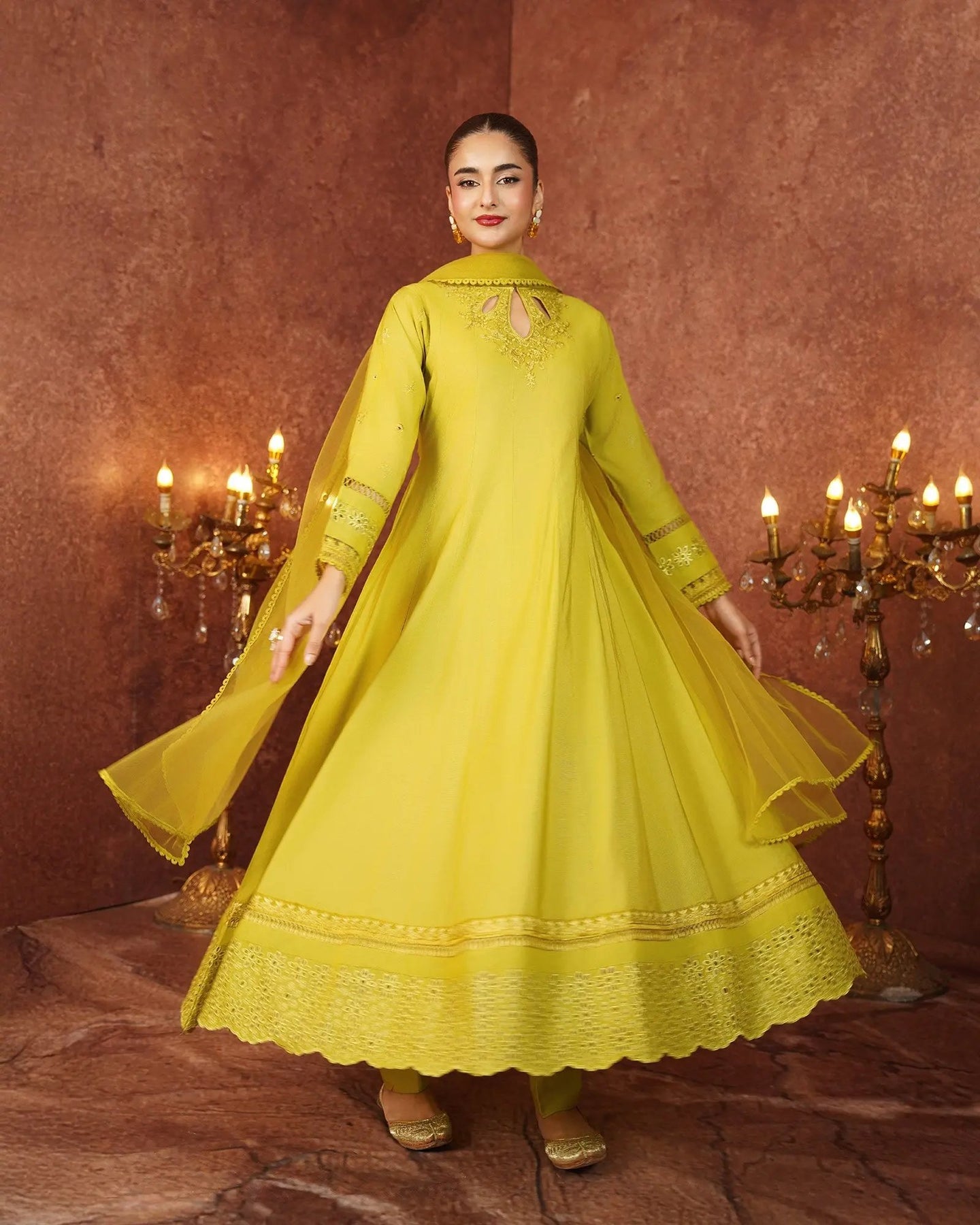 Crafted for special occasions, this paper katan 3-piece suit elevates your style with a long frock featuring a graceful keyhole neckline and refined work. The striking frock is highlighted with a chicken kari lace border, embroidered lace, and festive brilliance. Paired with elegant trousers and a dupatta, this outfit radiates royal charm.