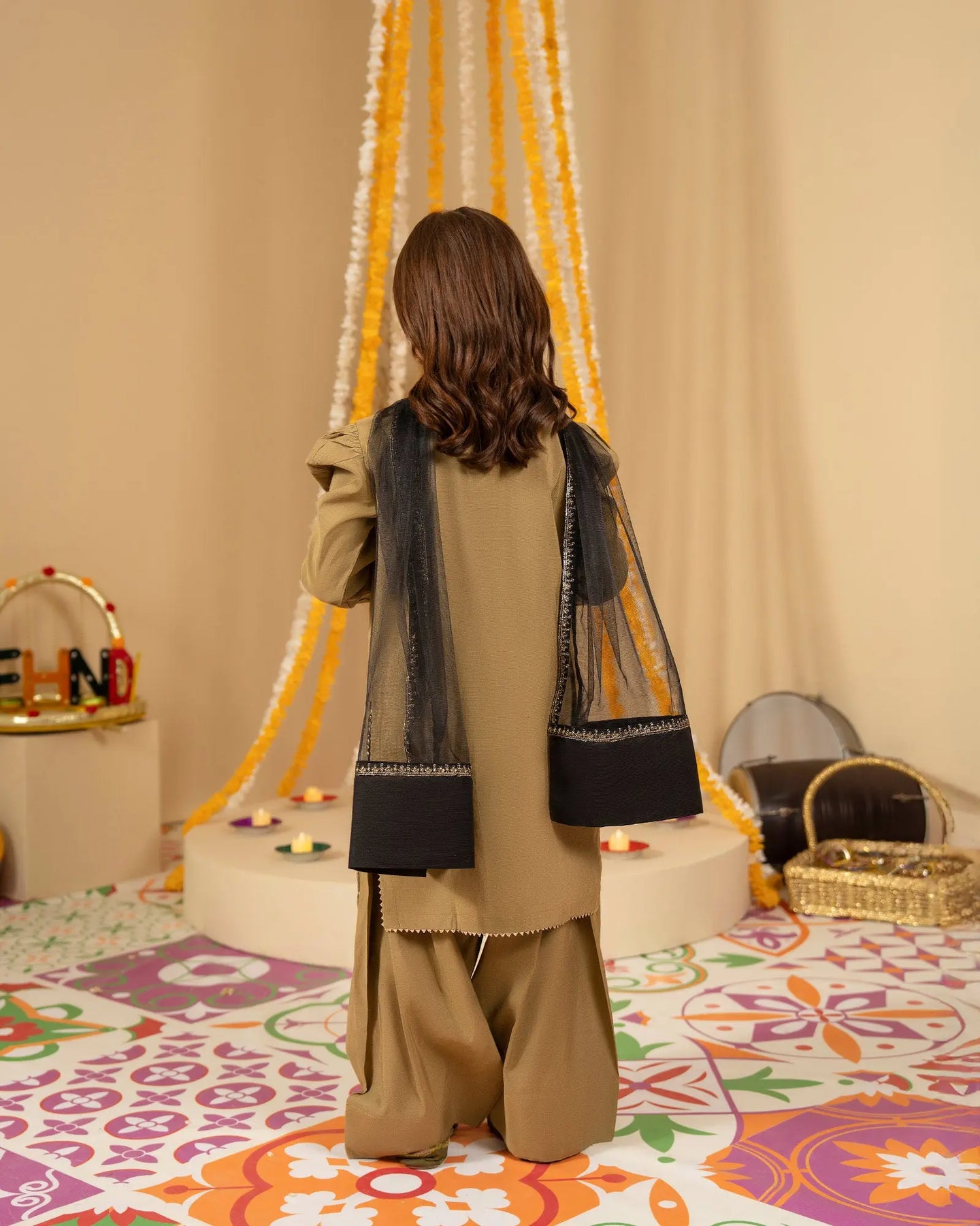 Step into elegance with this chic three-piece ensemble. The long paper katan shirt is beautifully adorned with intricate lace detail. Paired with matching paper katan shalwar and a sheer net dupatta with border, this look is a perfect blend of traditional sophistication—ideal for festive gatherings.