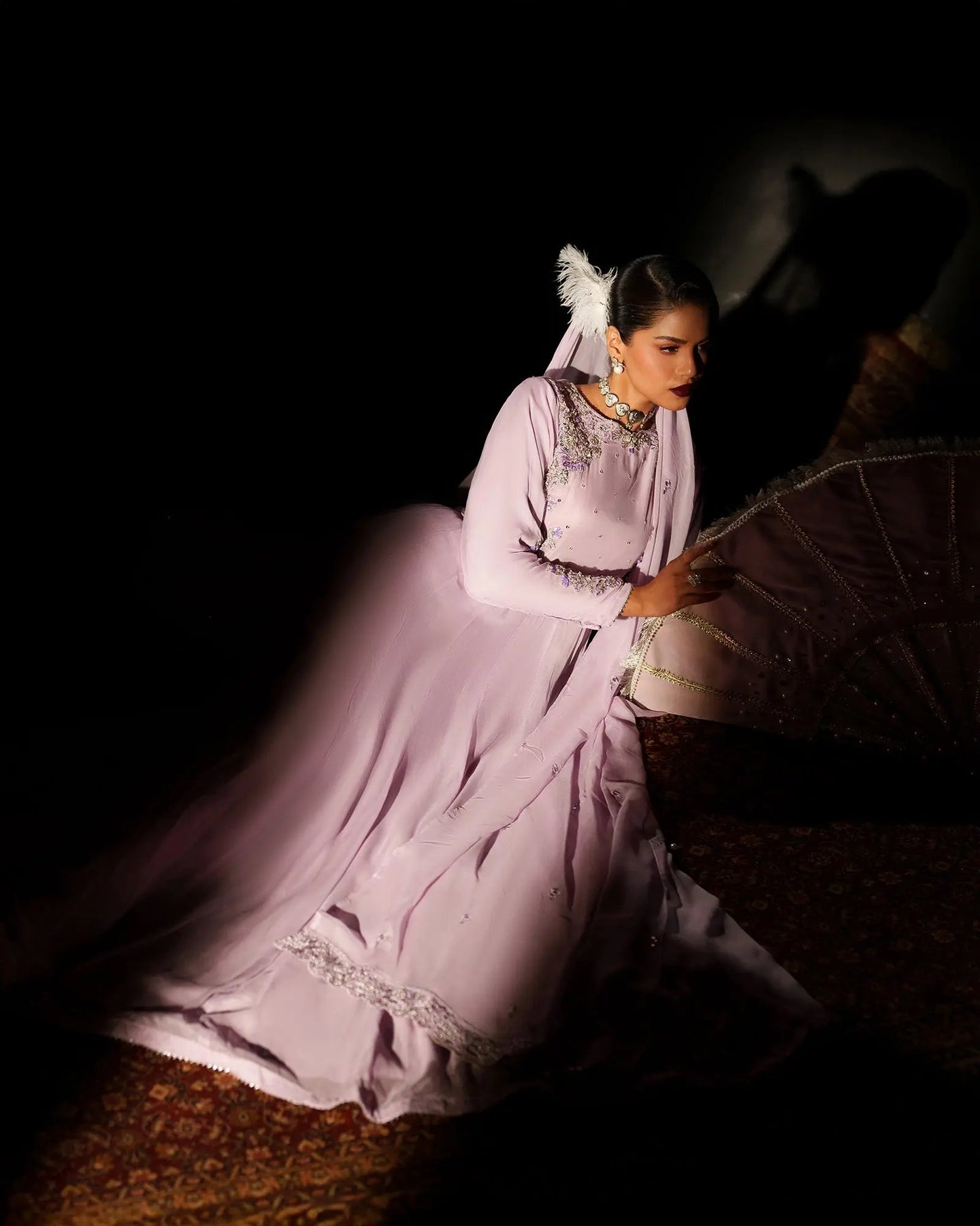Where tradition meets contemporary finesse. This chiffon 3-piece maxi features a long maxi style with bodice and full flare, embellished sleeves, and a yoke adorned with tilla, sequins, beads, lace, cutwork, and fine handwork. Styled with trousers and a bordered dupatta, this look radiates timeless sophistication.