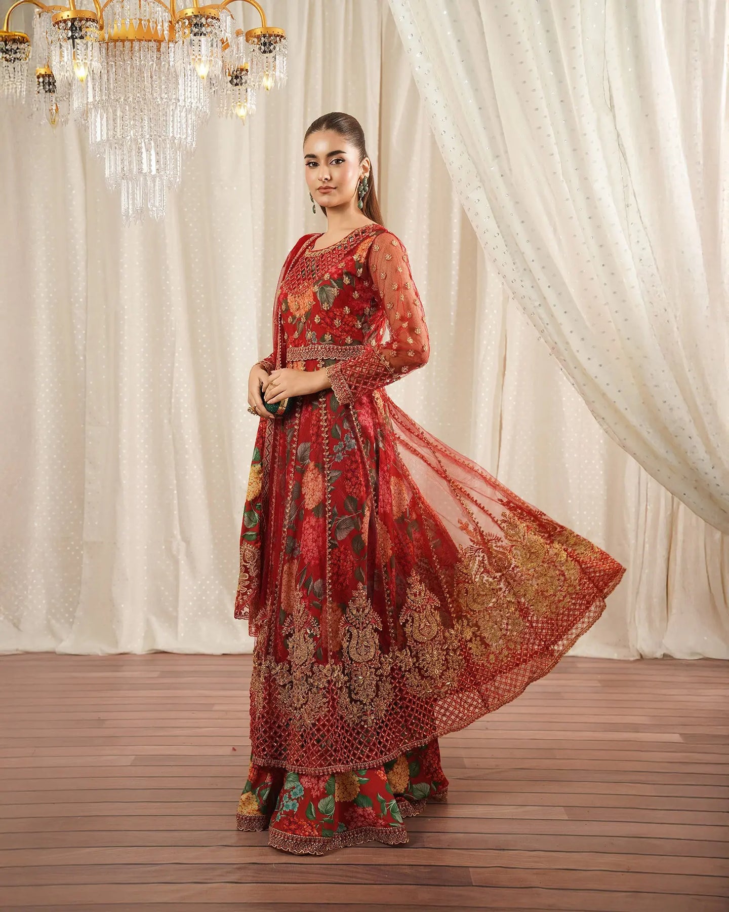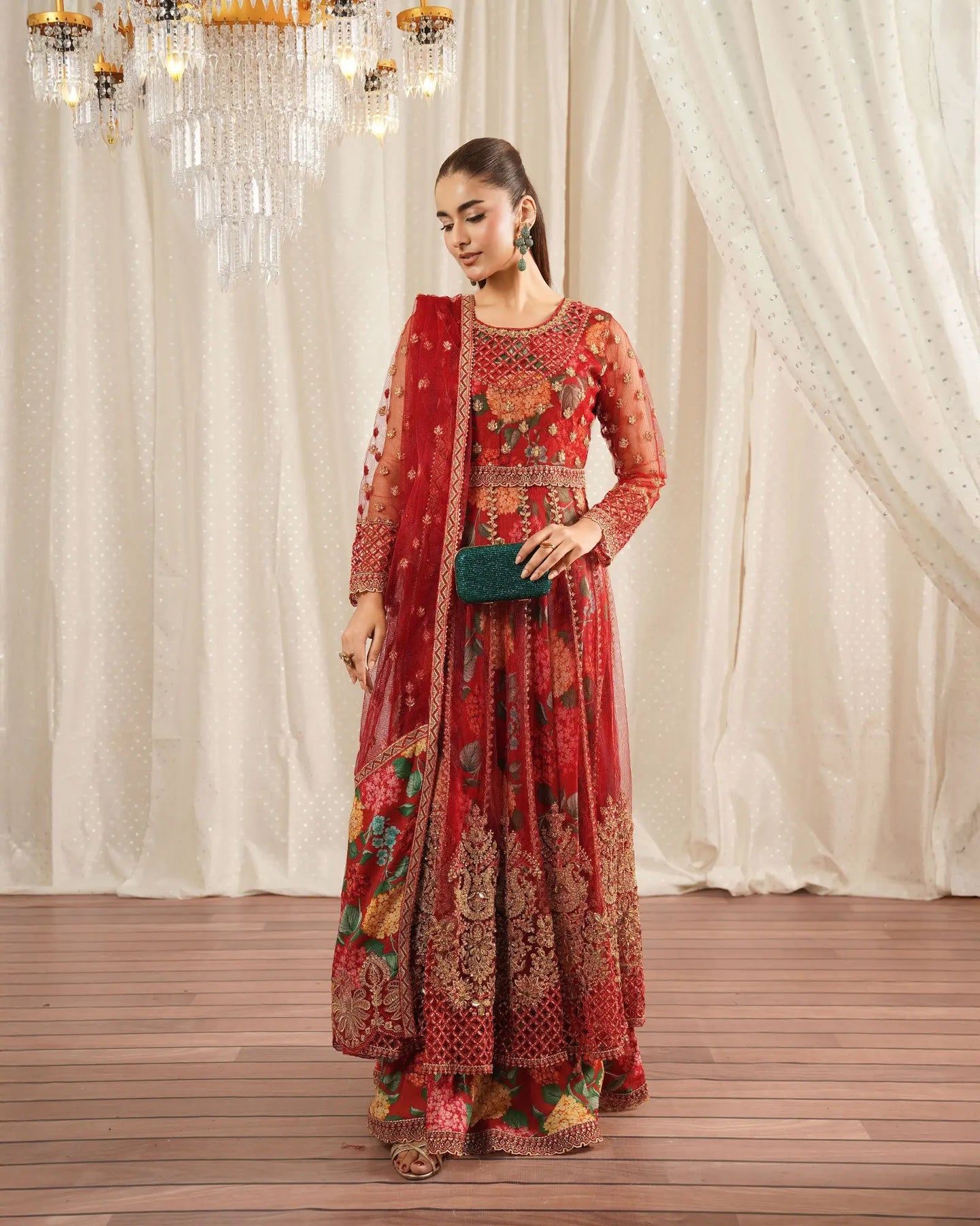 This traditional and modern-day 3-piece pashwas is the showstopper of the season. Crafted with a floral-printed base combined with a net gown with a front opening adorned with lace, cutwork, tilla, sequins, and adda with bead finishings, its double border gives the effect of pure sophistication. Paired with a net dupatta with border applique finishings and with printed culottes, it gives an effortlessly pleasing look.