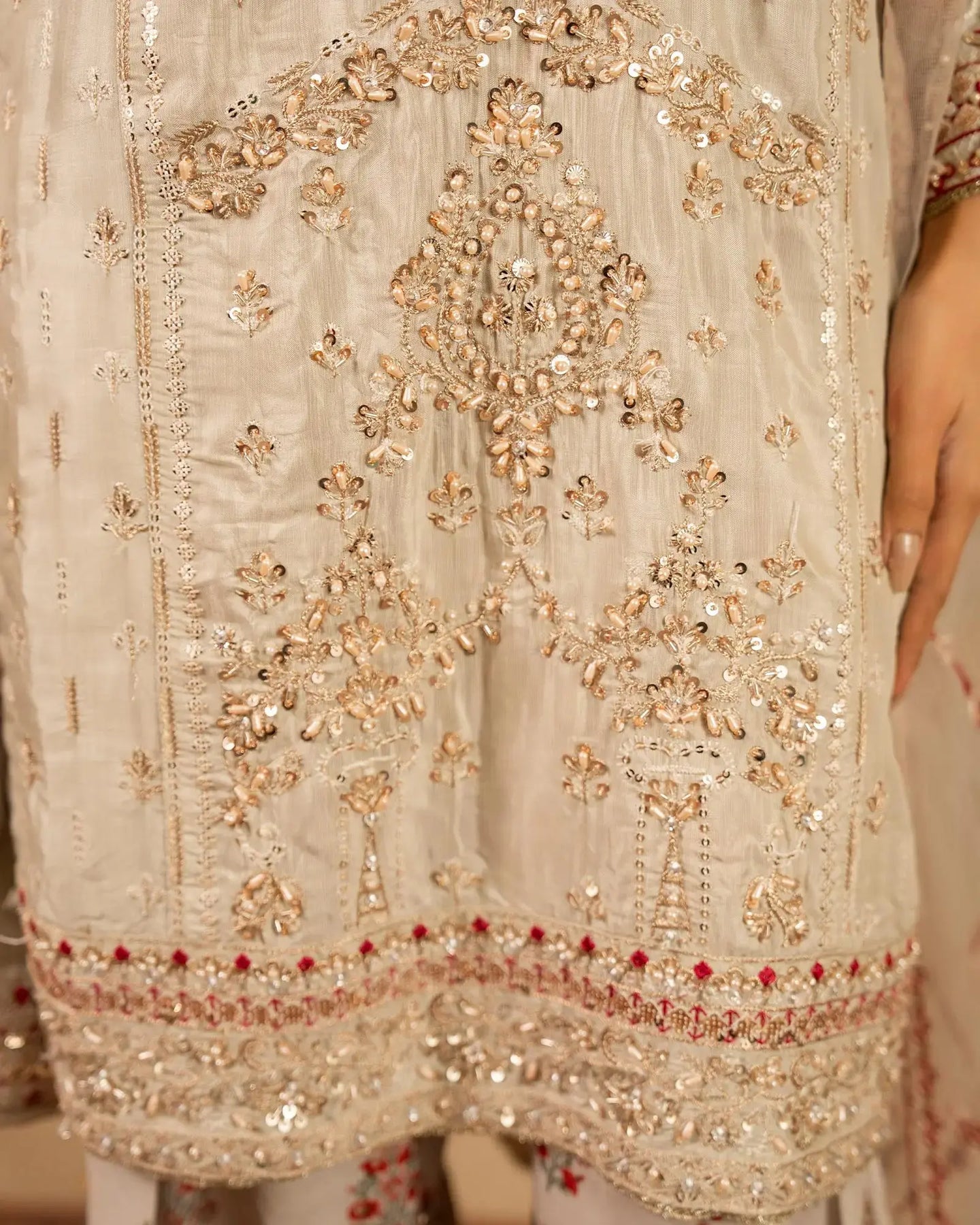 Step into refined sophistication with this elegant 3-piece suit, featuring a kurta shirt adorned with fine contrasting embroidery, tilla, sequins, and handwork, complemented by sleek printed fabric finished with a shalwar and a beautifully bordered net dupatta, complemented with a bag perfect for semi-formal events.