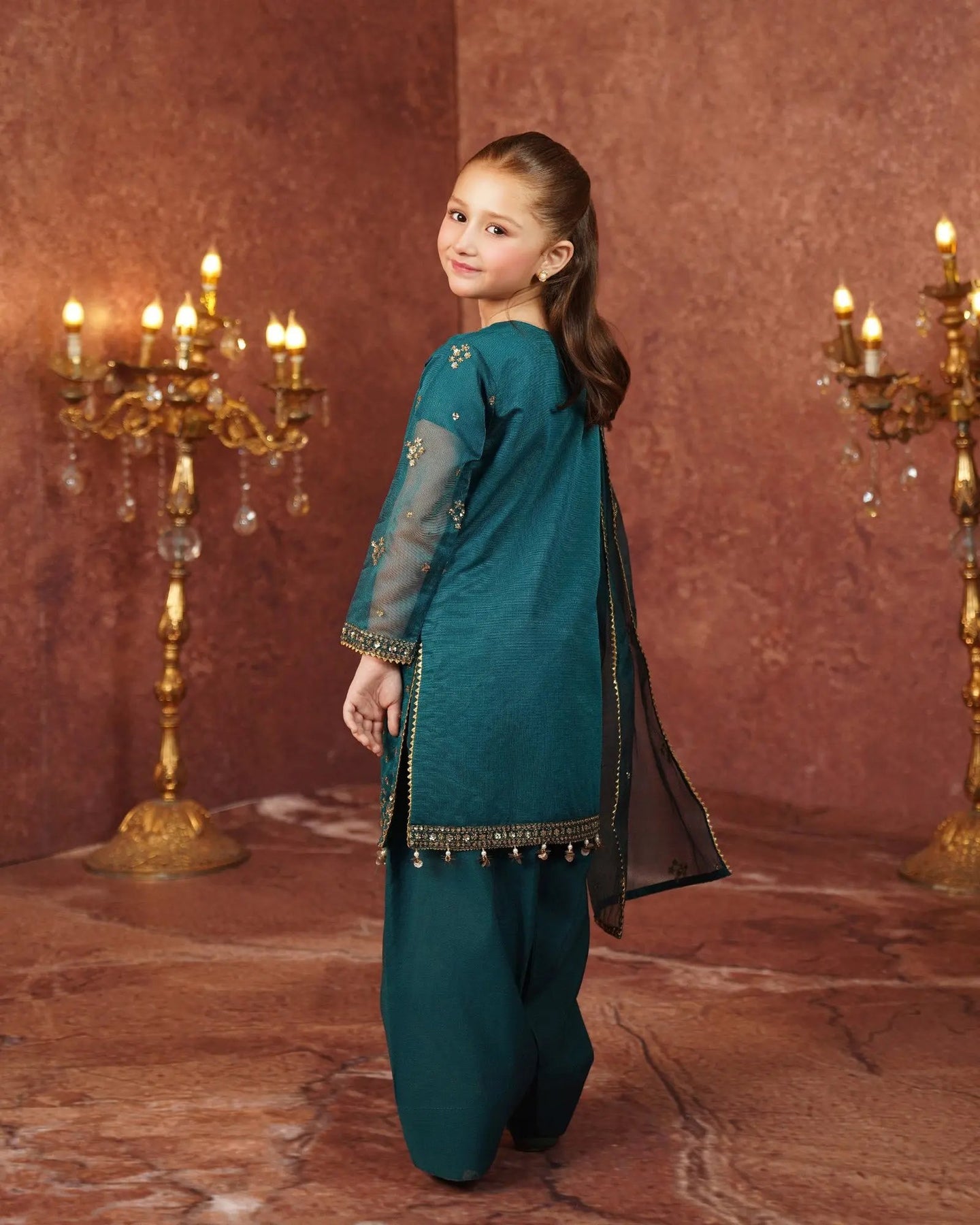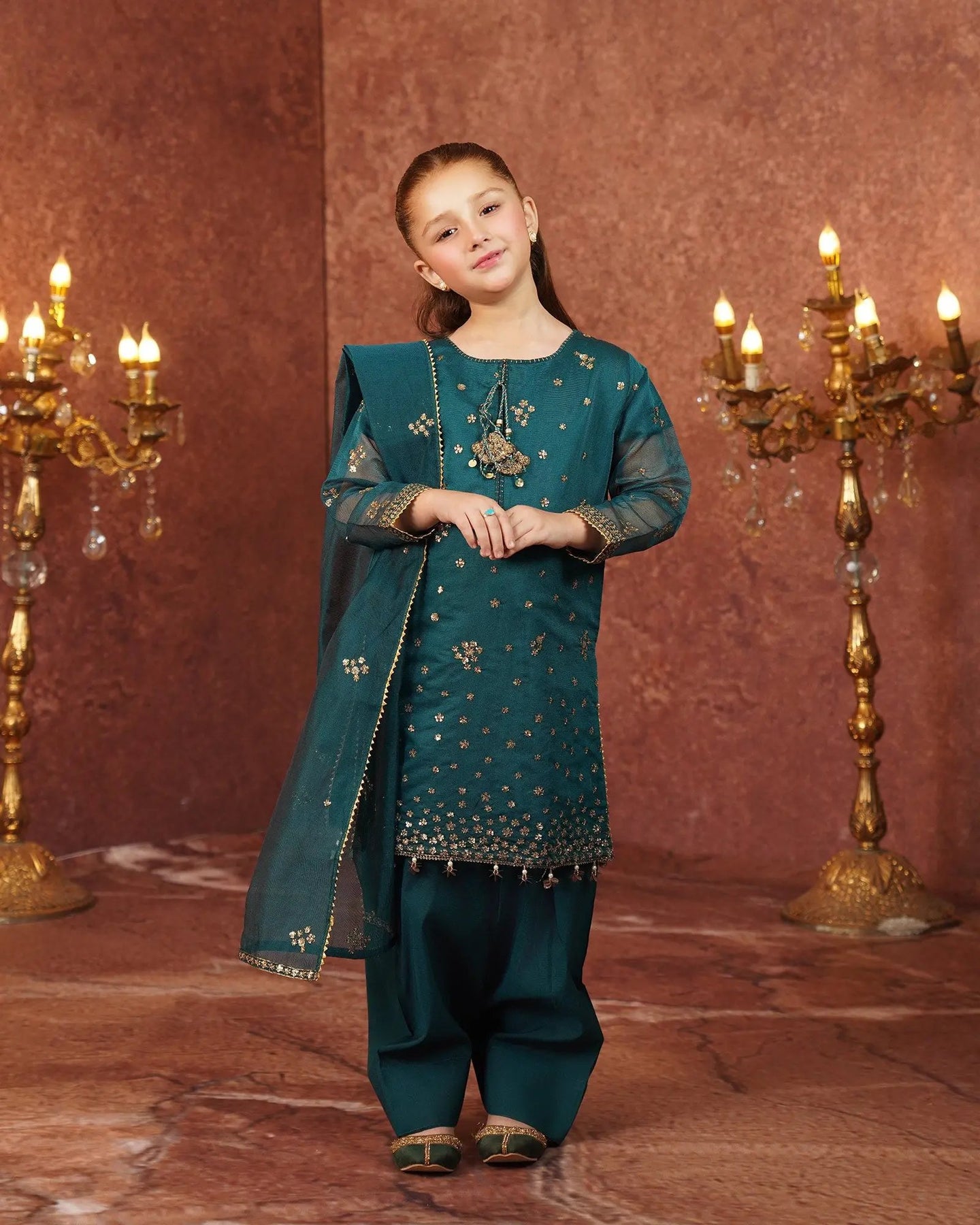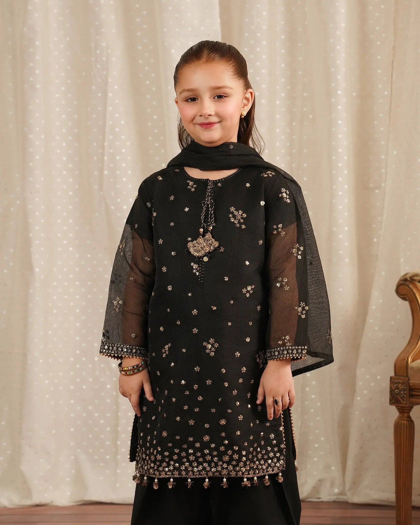 This simple but elegant attire brings a new look to your kids' wardrobe. A classy kameez adorned with tilla, embroidery, sequins, and hangings on sleeves and hem added extra beauty with neckline tassels and finishings paired with farshi shalwar and bori net dupatta with border finishings.