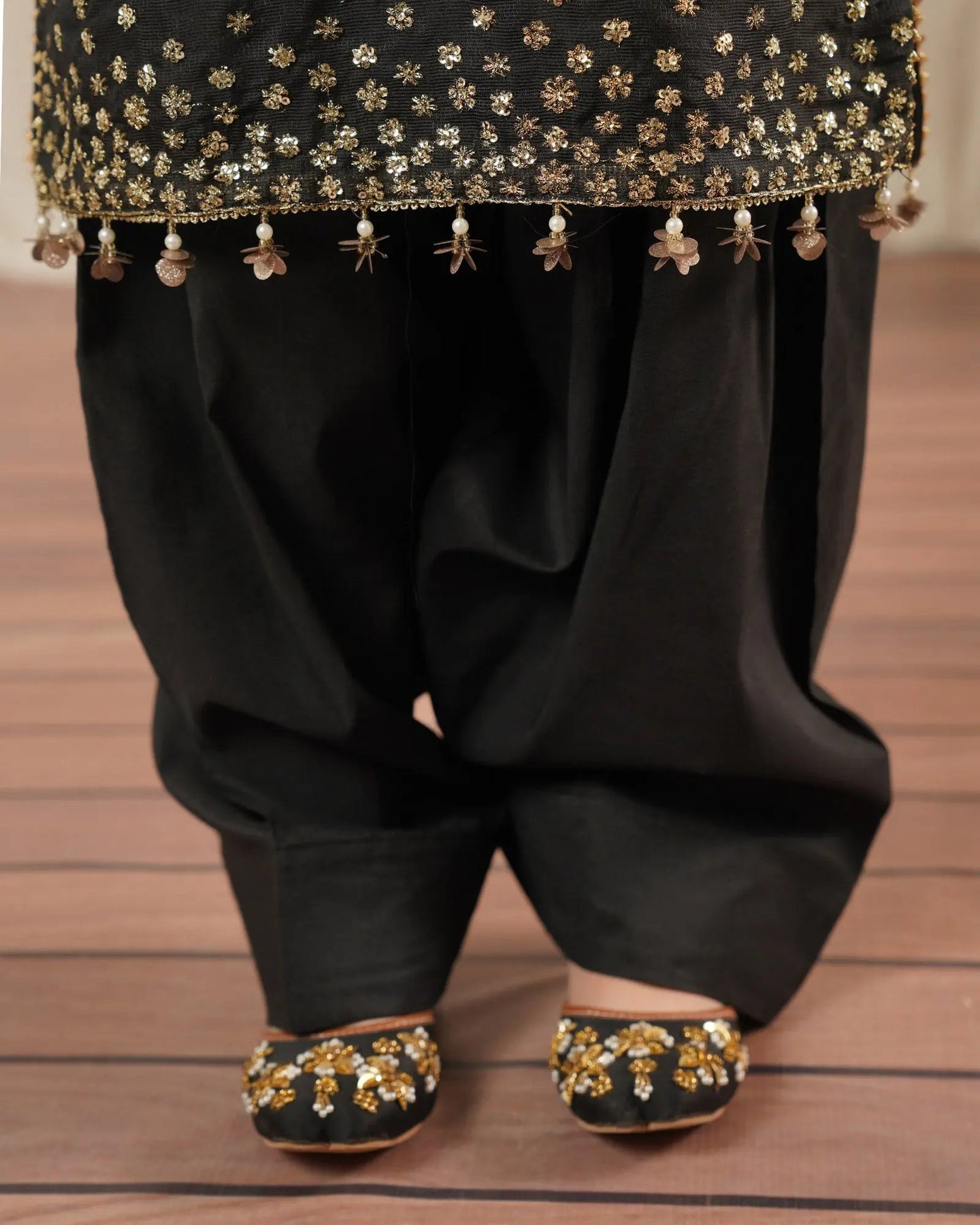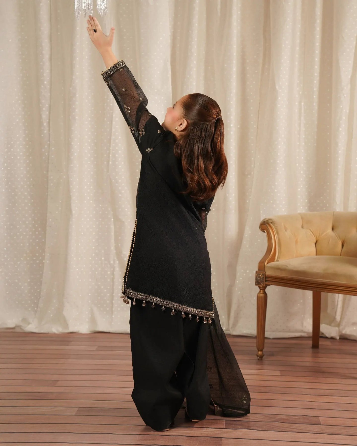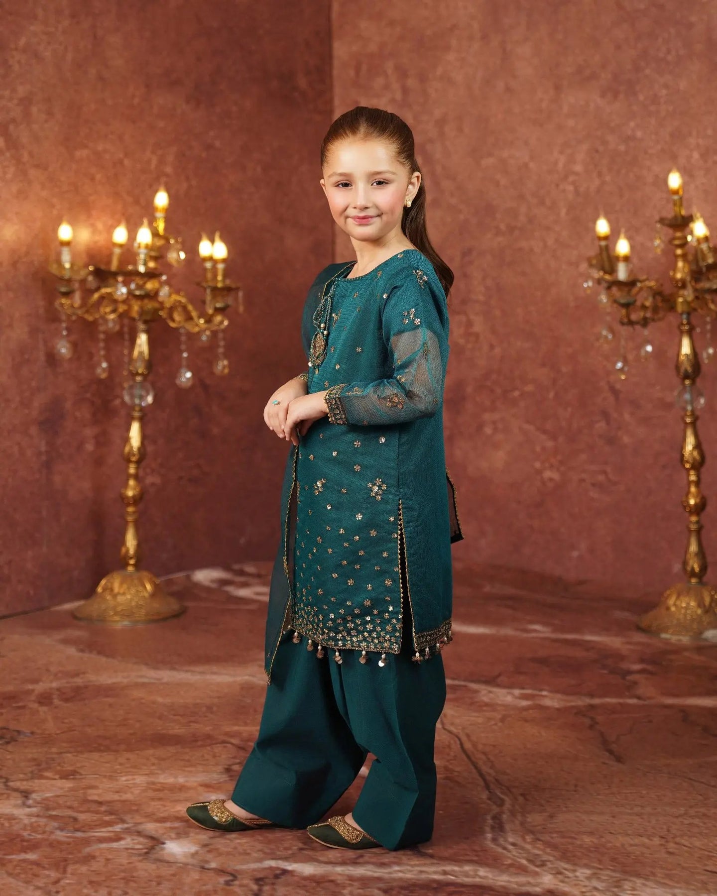 This simple but elegant attire brings a new look to your kids' wardrobe. A classy kameez adorned with tilla, embroidery, sequins, and hangings on sleeves and hem added extra beauty with neckline tassels and finishings paired with farshi shalwar and bori net dupatta with border finishings.