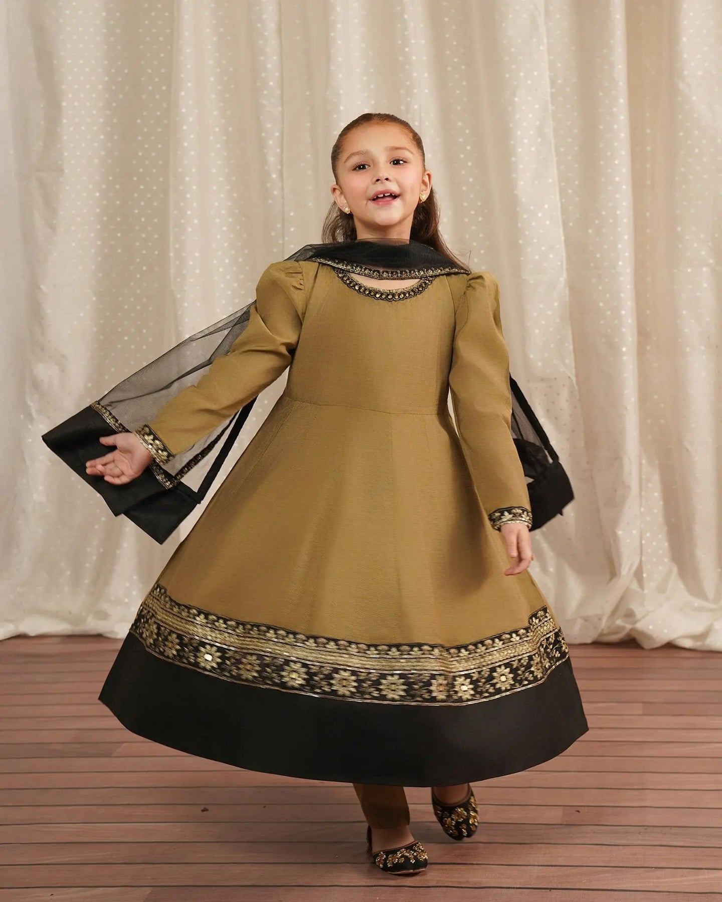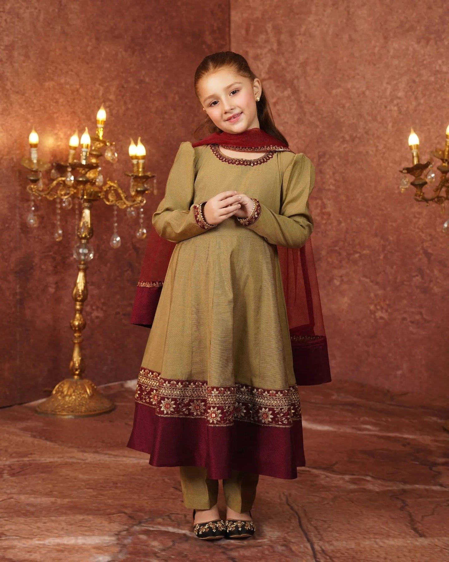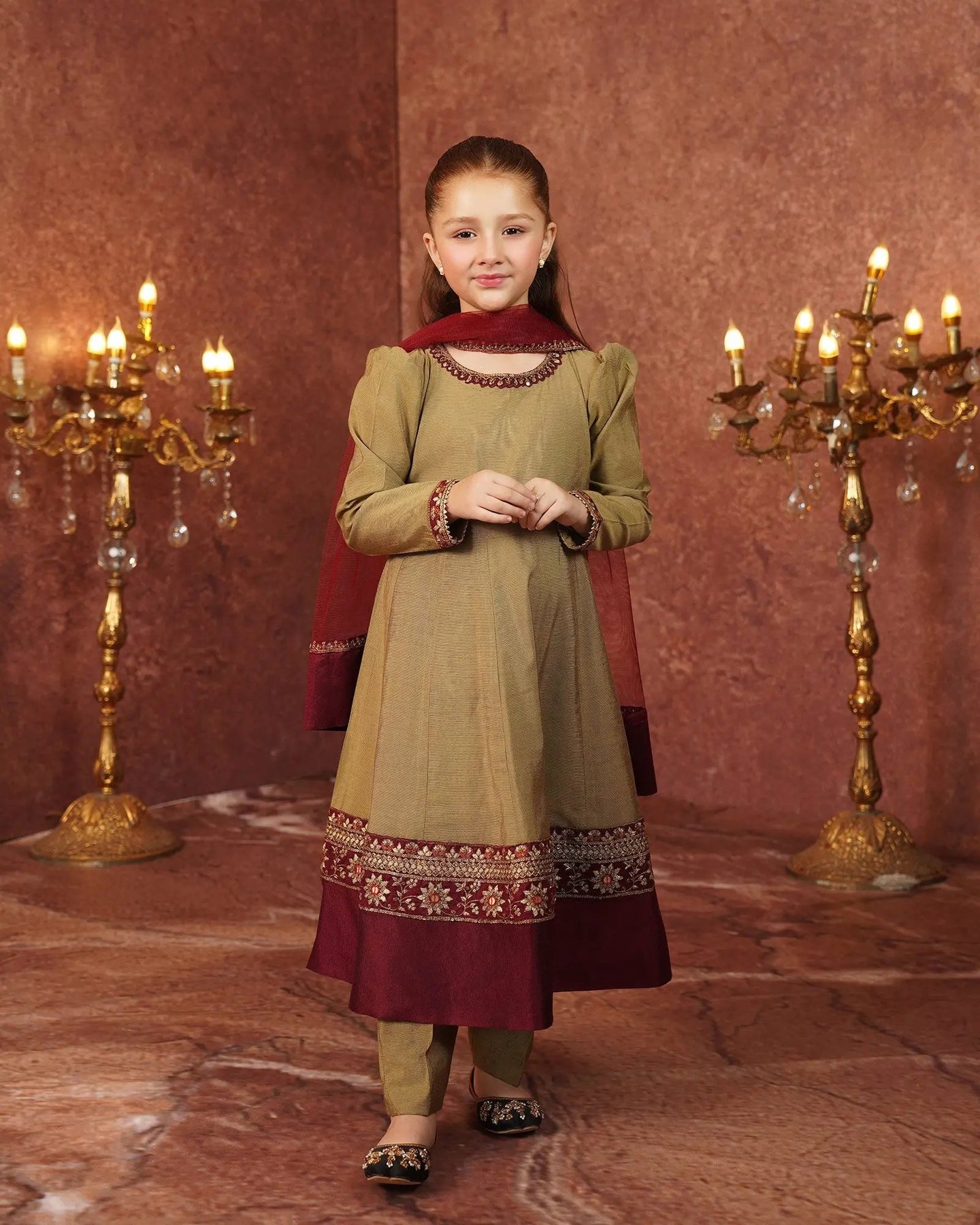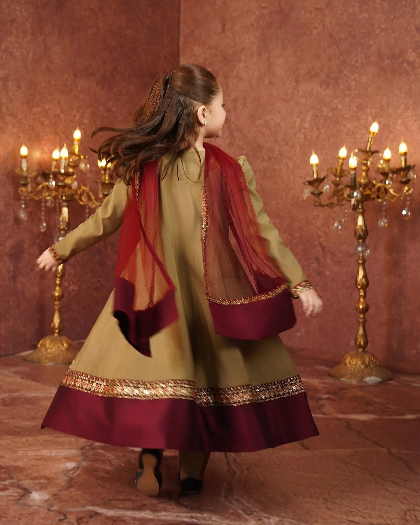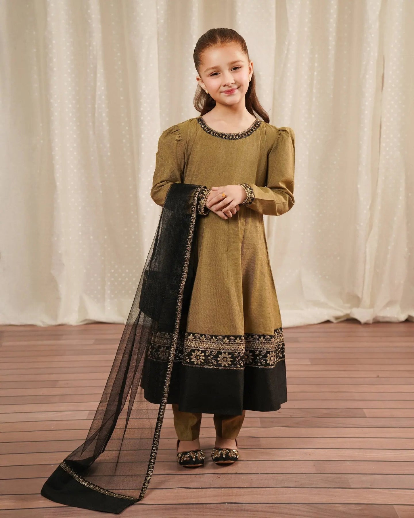 Crafted to impress, this paper katan kids' 3-piece showcases a long frock with a classic boat neckline and intricate sleeve detailing. The border comes alive with tilla, sequins, beads, lace, and appliqué border. Paired with trousers and a bordered dupatta, this outfit delivers a truly majestic appeal.