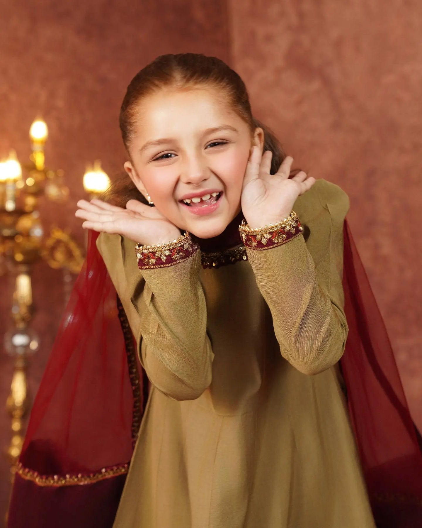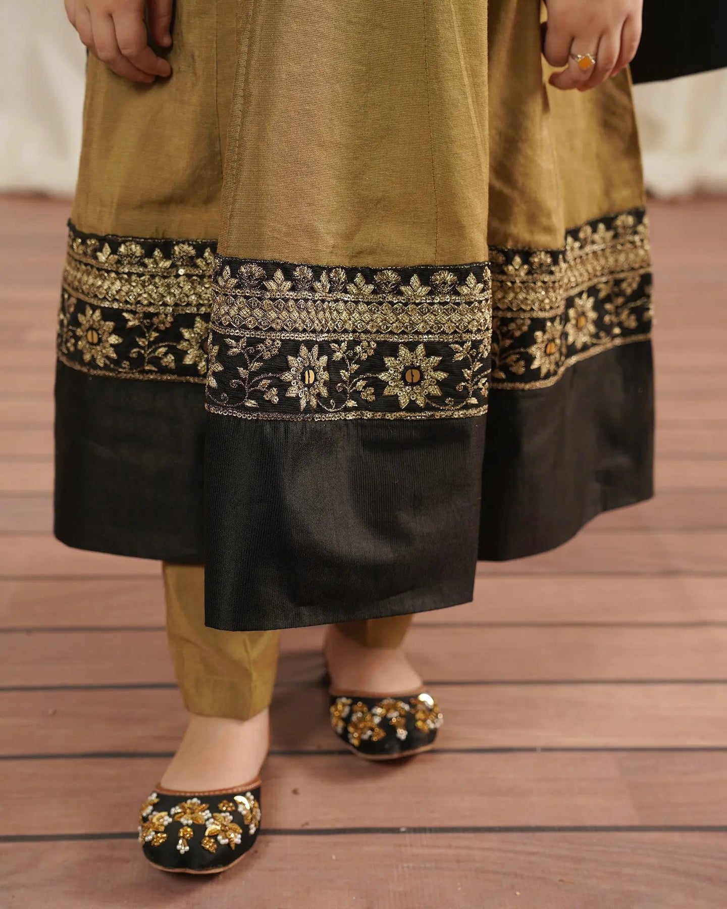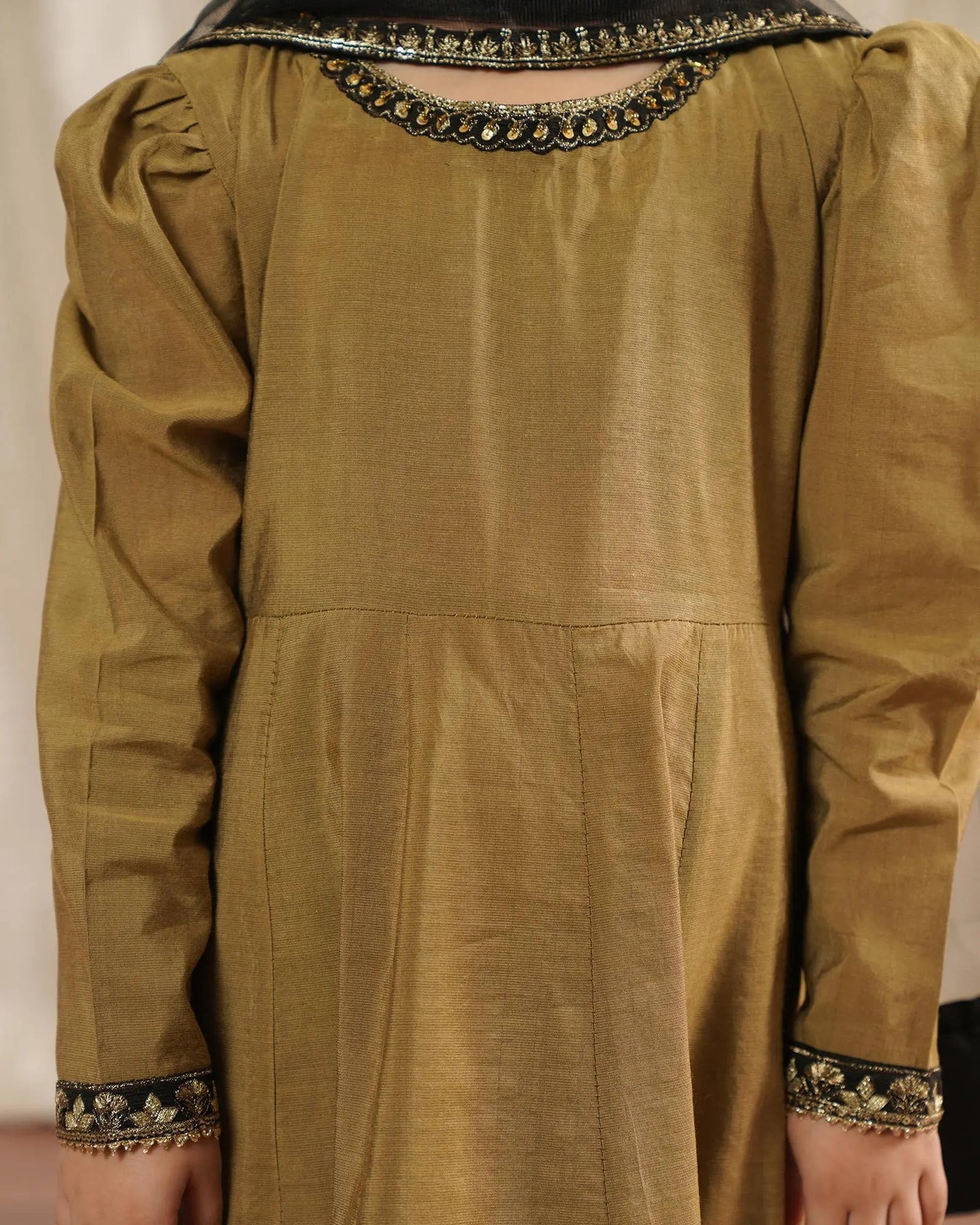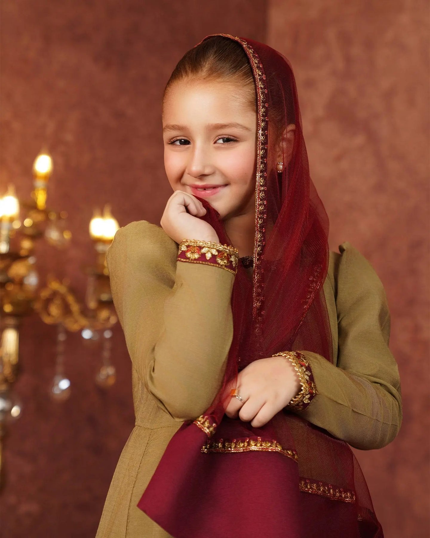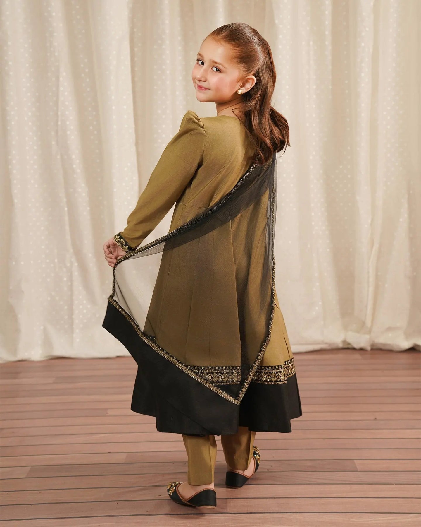 Crafted to impress, this paper katan kids' 3-piece showcases a long frock with a classic boat neckline and intricate sleeve detailing. The border comes alive with tilla, sequins, beads, lace, and appliqué border. Paired with trousers and a bordered dupatta, this outfit delivers a truly majestic appeal.