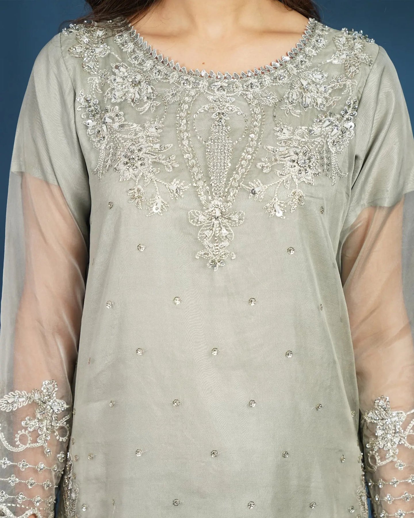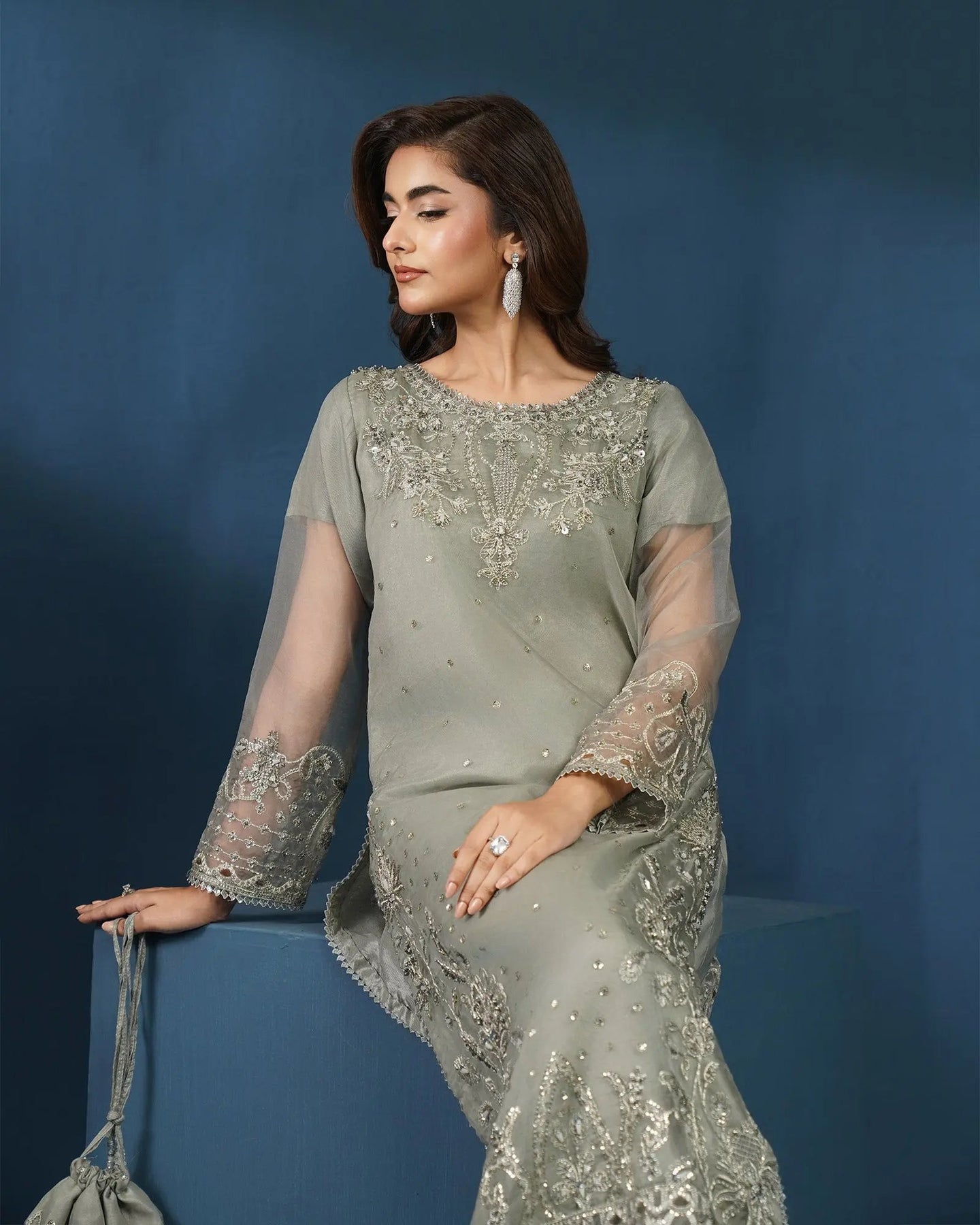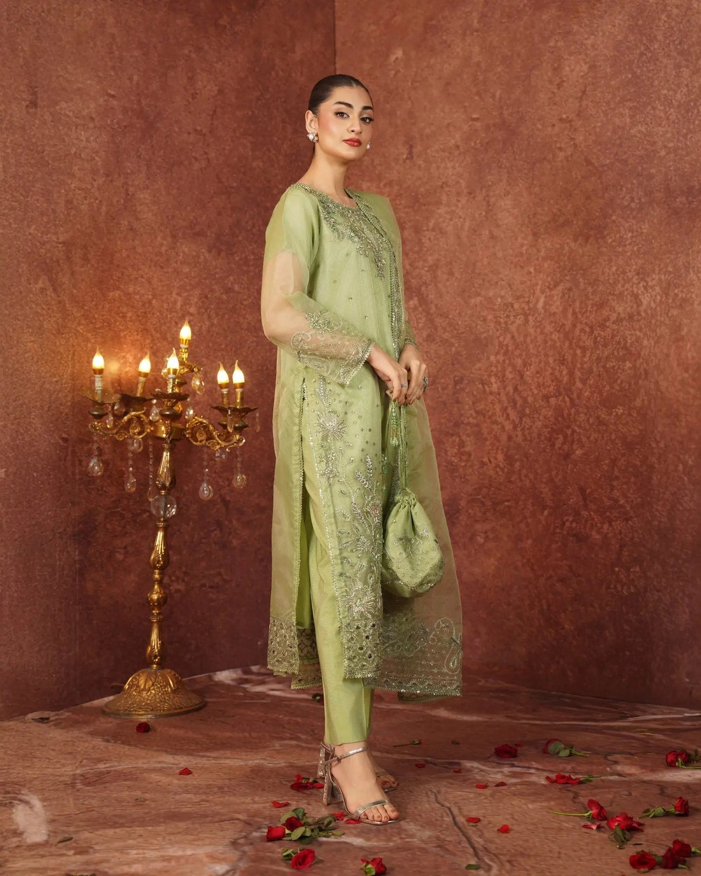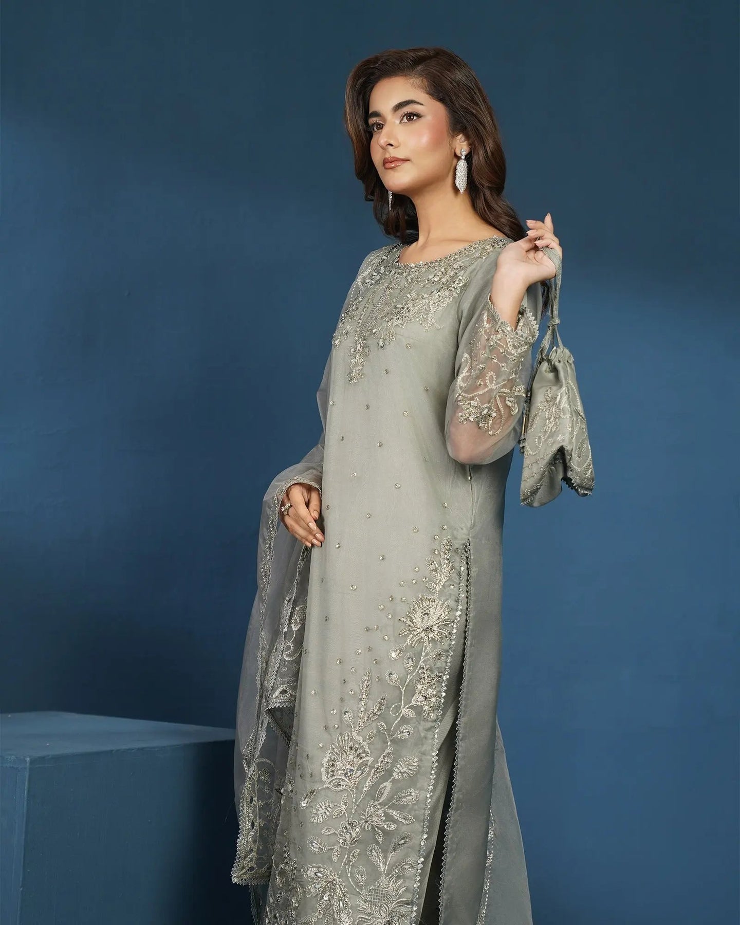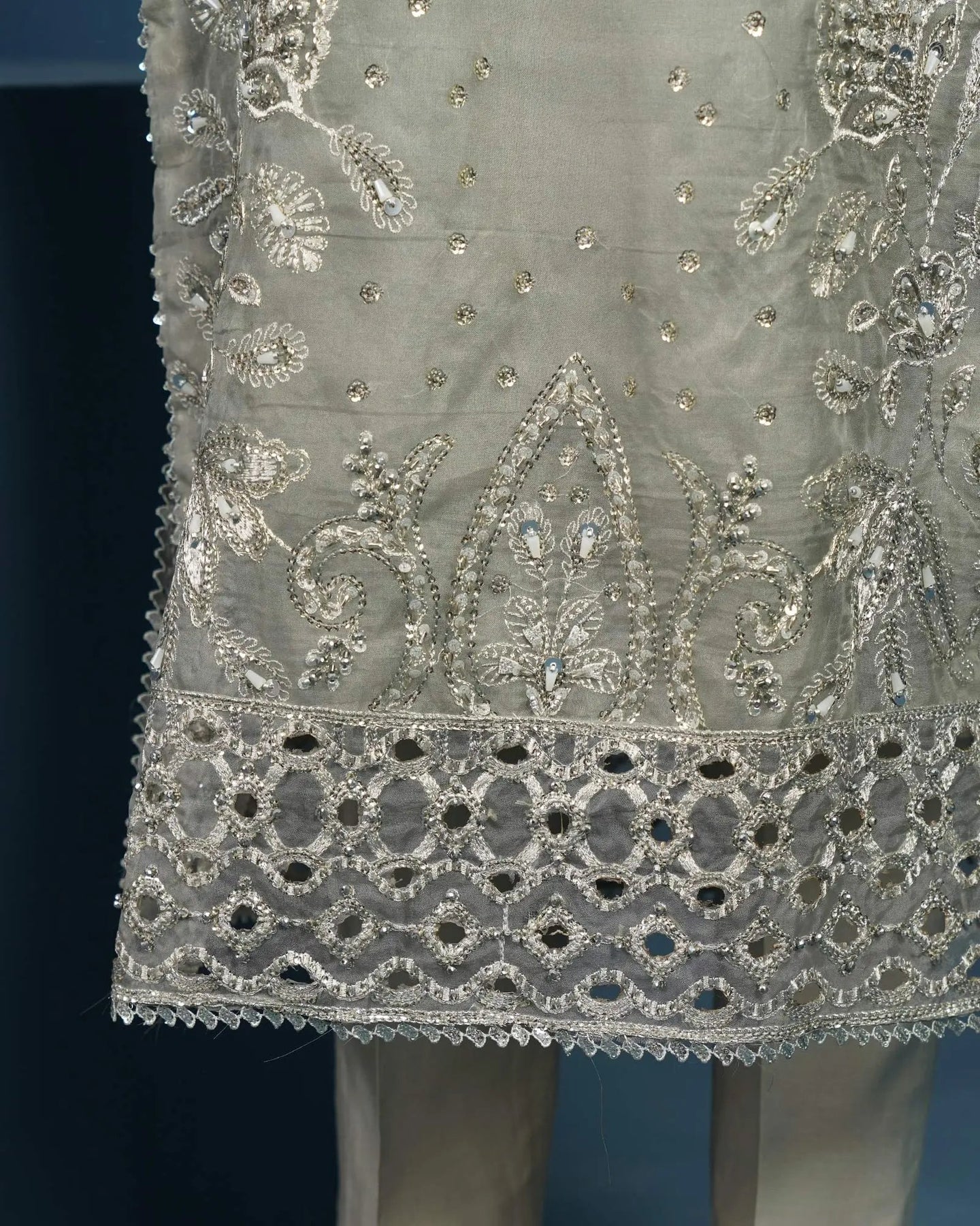 This simple but elegant attire brings a new look to your wardrobe. A classy kameez adorned with tilla, embroidery, sequins, beads, and lace added extra beauty with cutwork finishings paired with tailored trousers and a tissue dupatta with border finishings. giving a complete look.