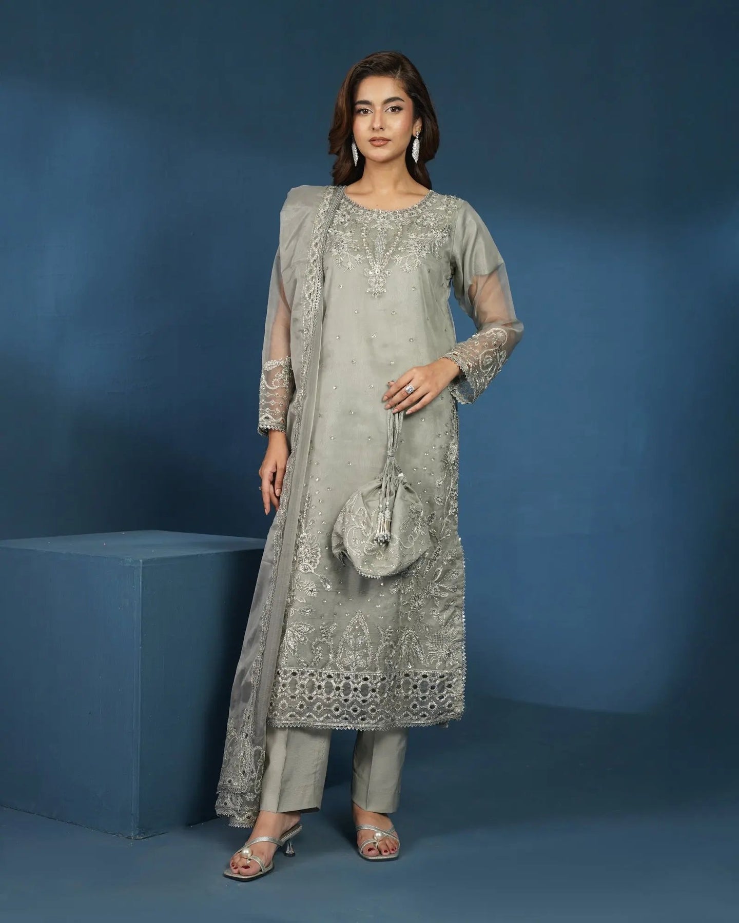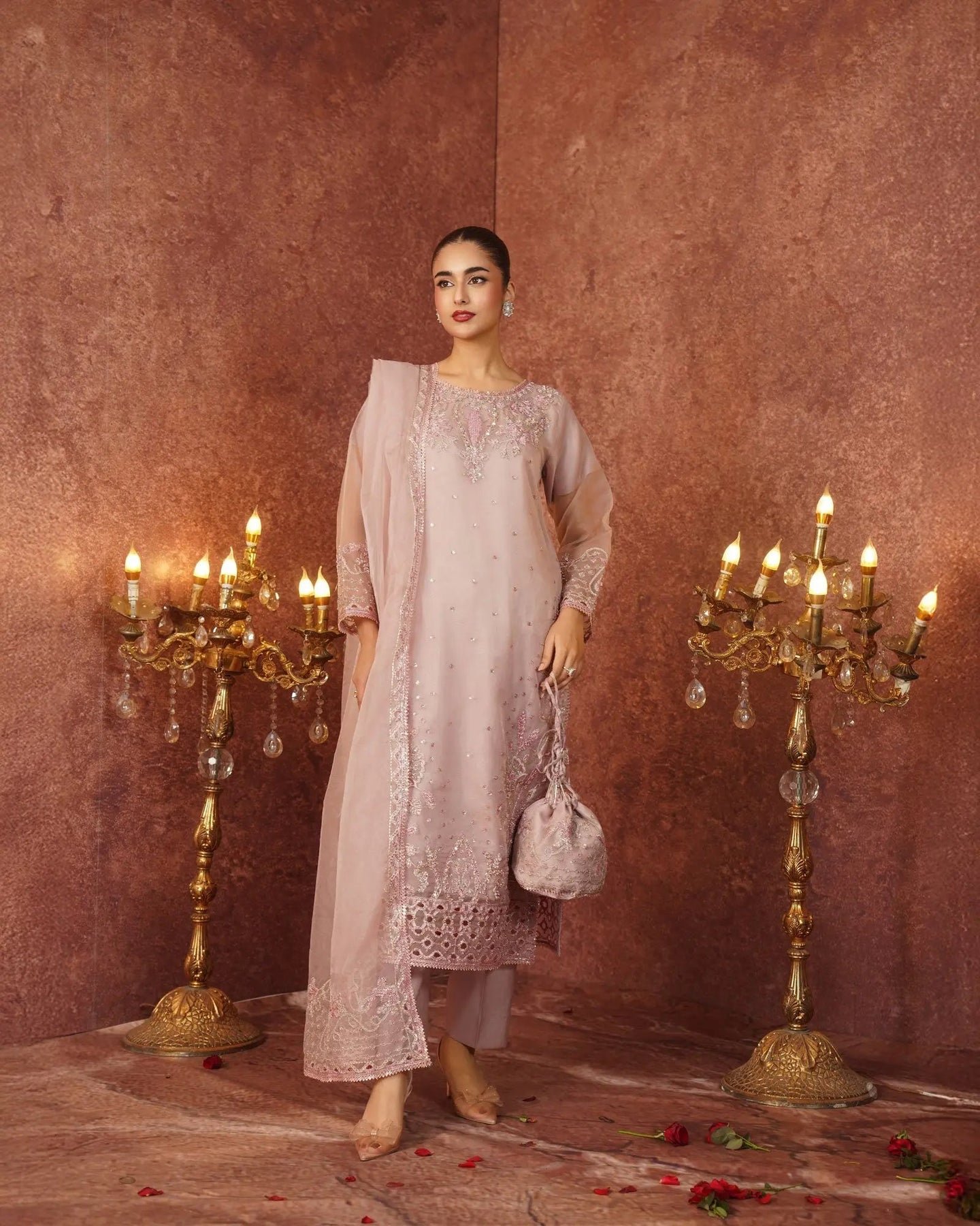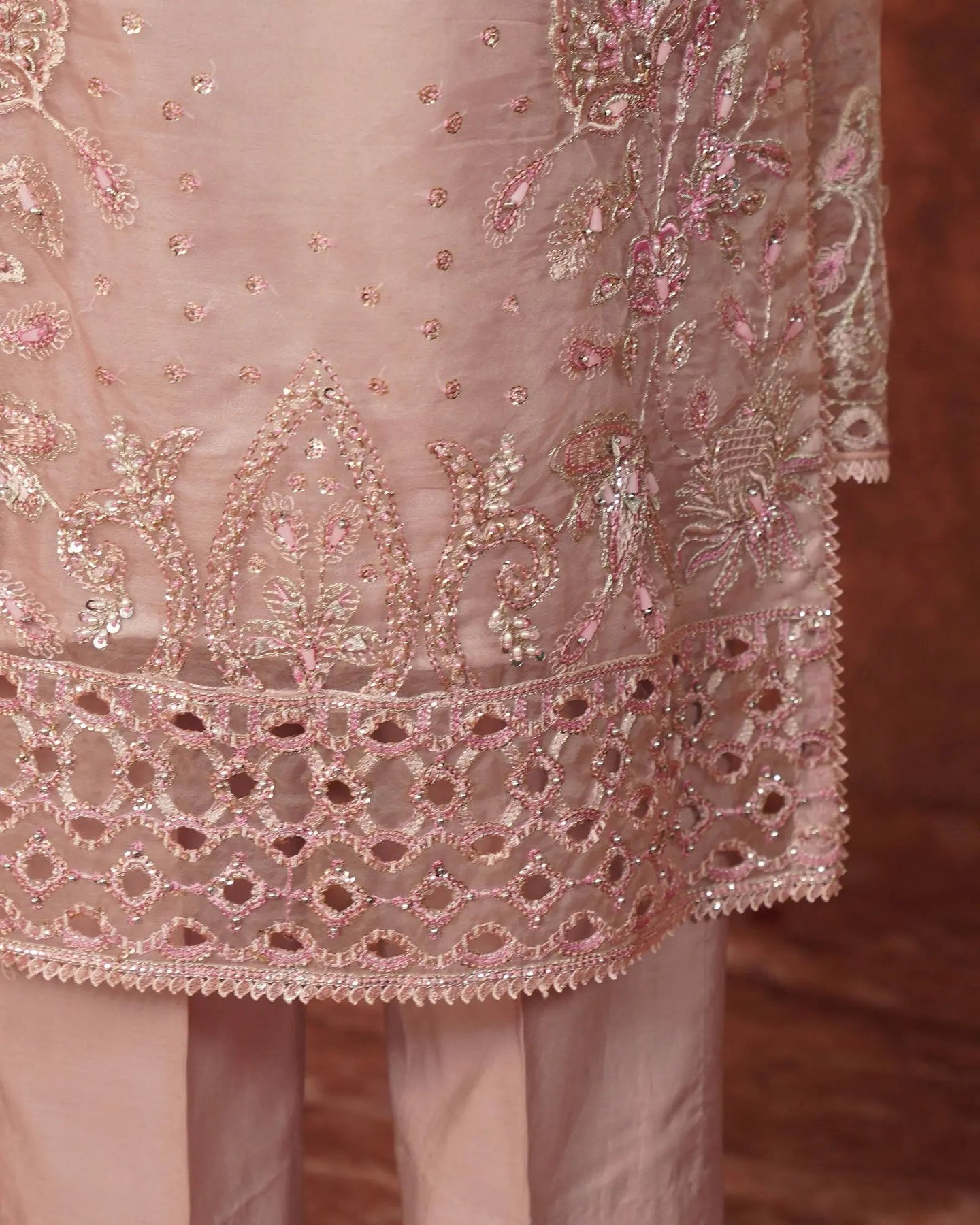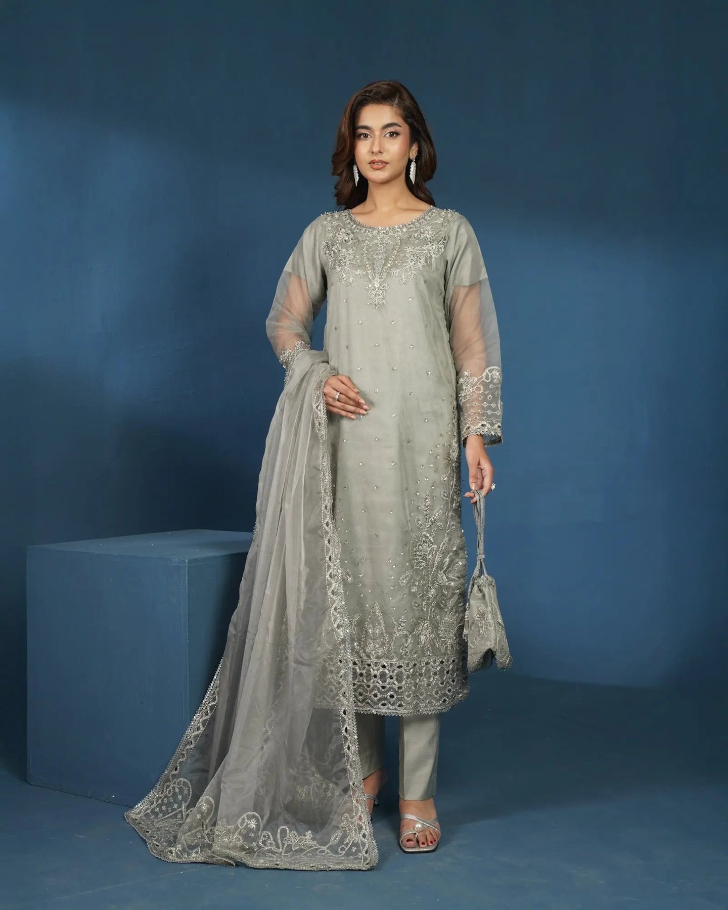 This simple but elegant attire brings a new look to your wardrobe. A classy kameez adorned with tilla, embroidery, sequins, beads, and lace added extra beauty with cutwork finishings paired with tailored trousers and a tissue dupatta with border finishings. giving a complete look.