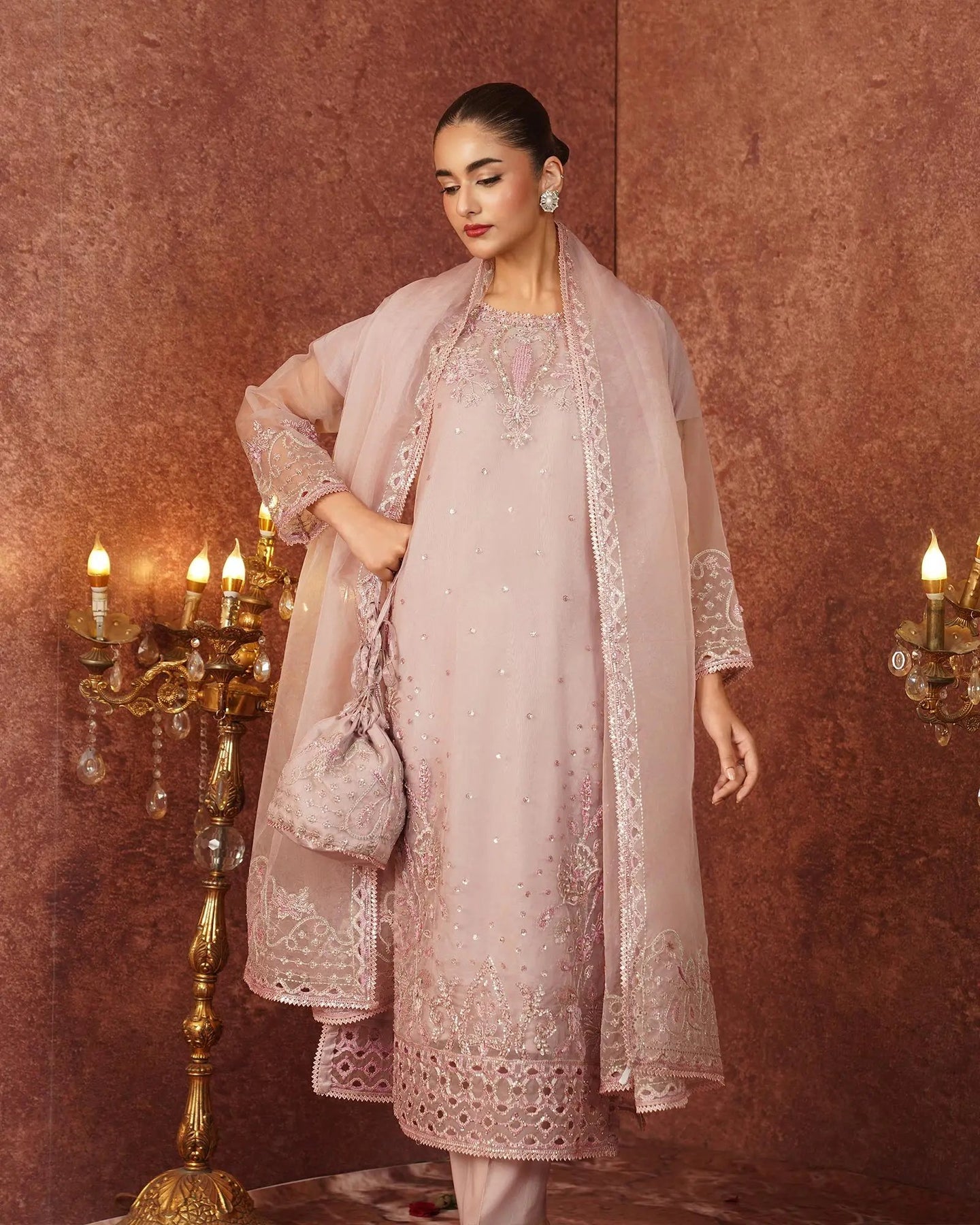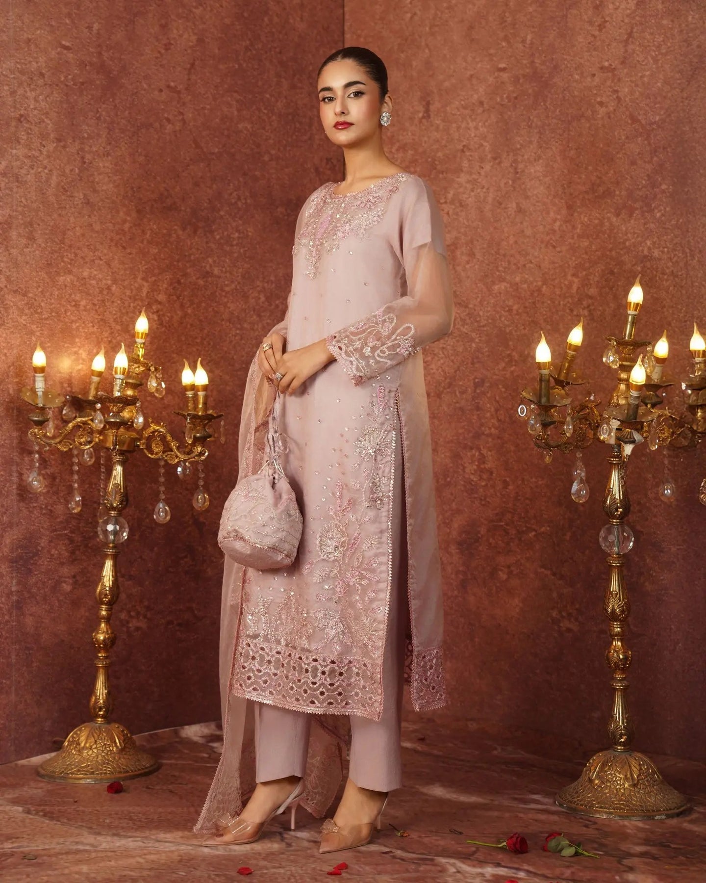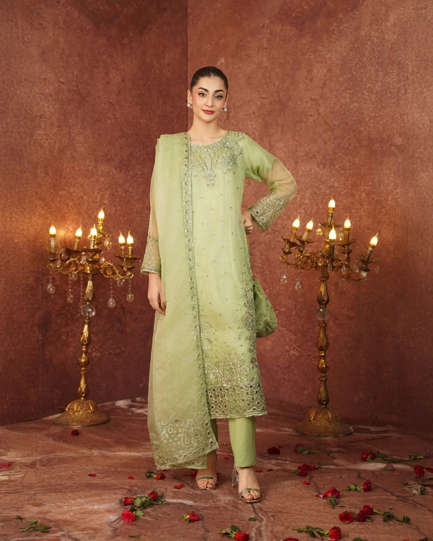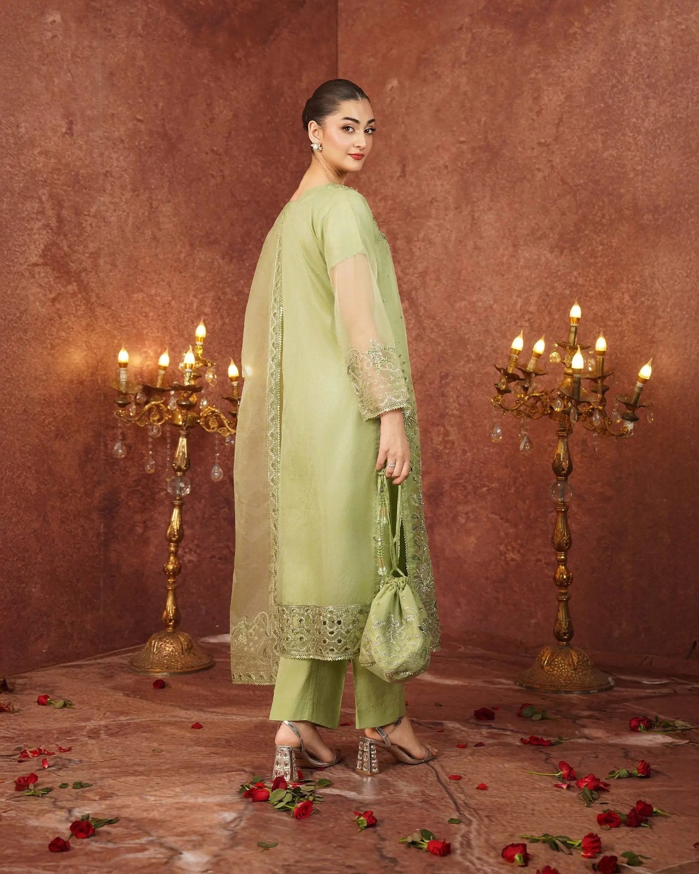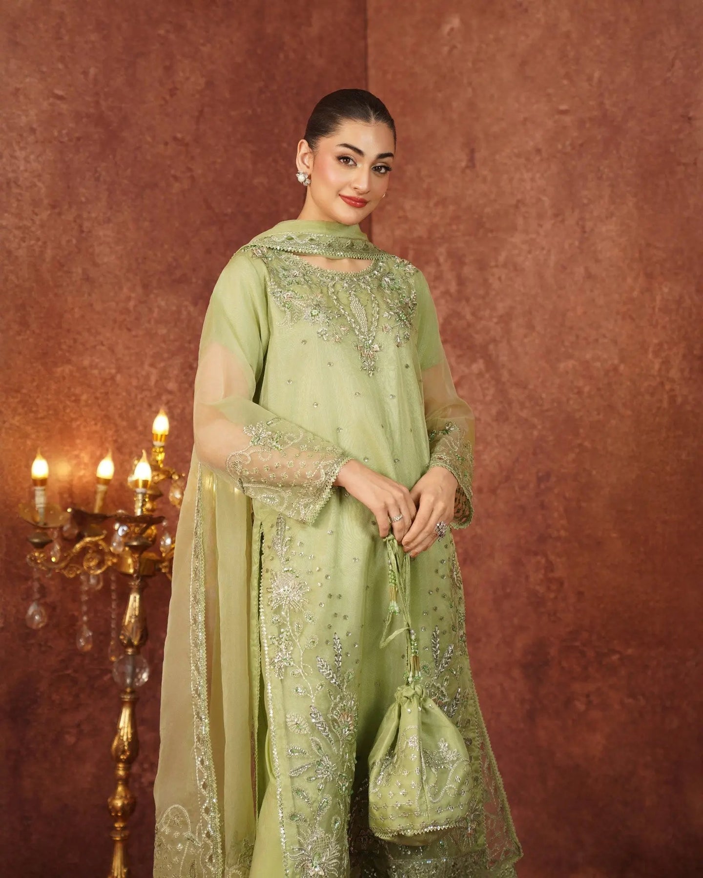 This simple but elegant attire brings a new look to your wardrobe. A classy kameez adorned with tilla, embroidery, sequins, beads, and lace added extra beauty with cutwork finishings paired with tailored trousers and a tissue dupatta with border finishings. giving a complete look.