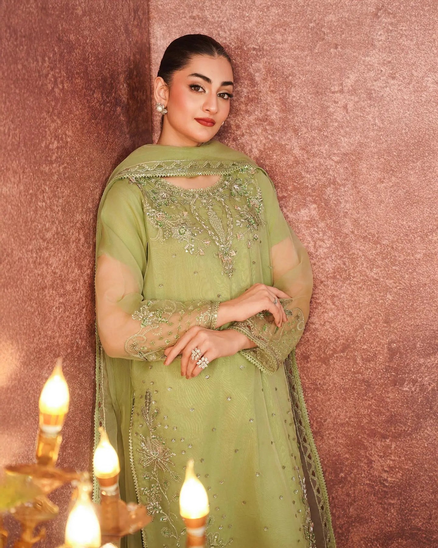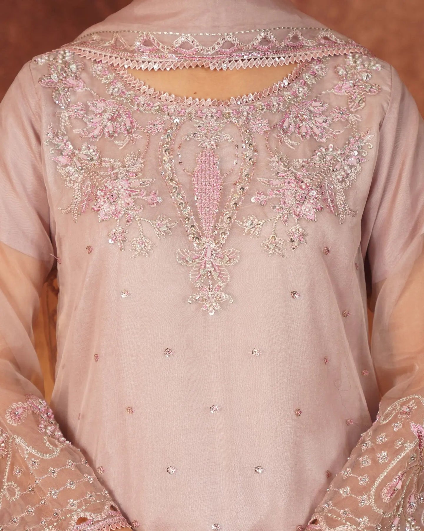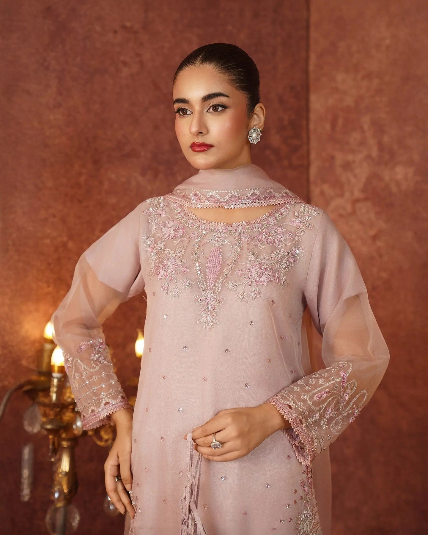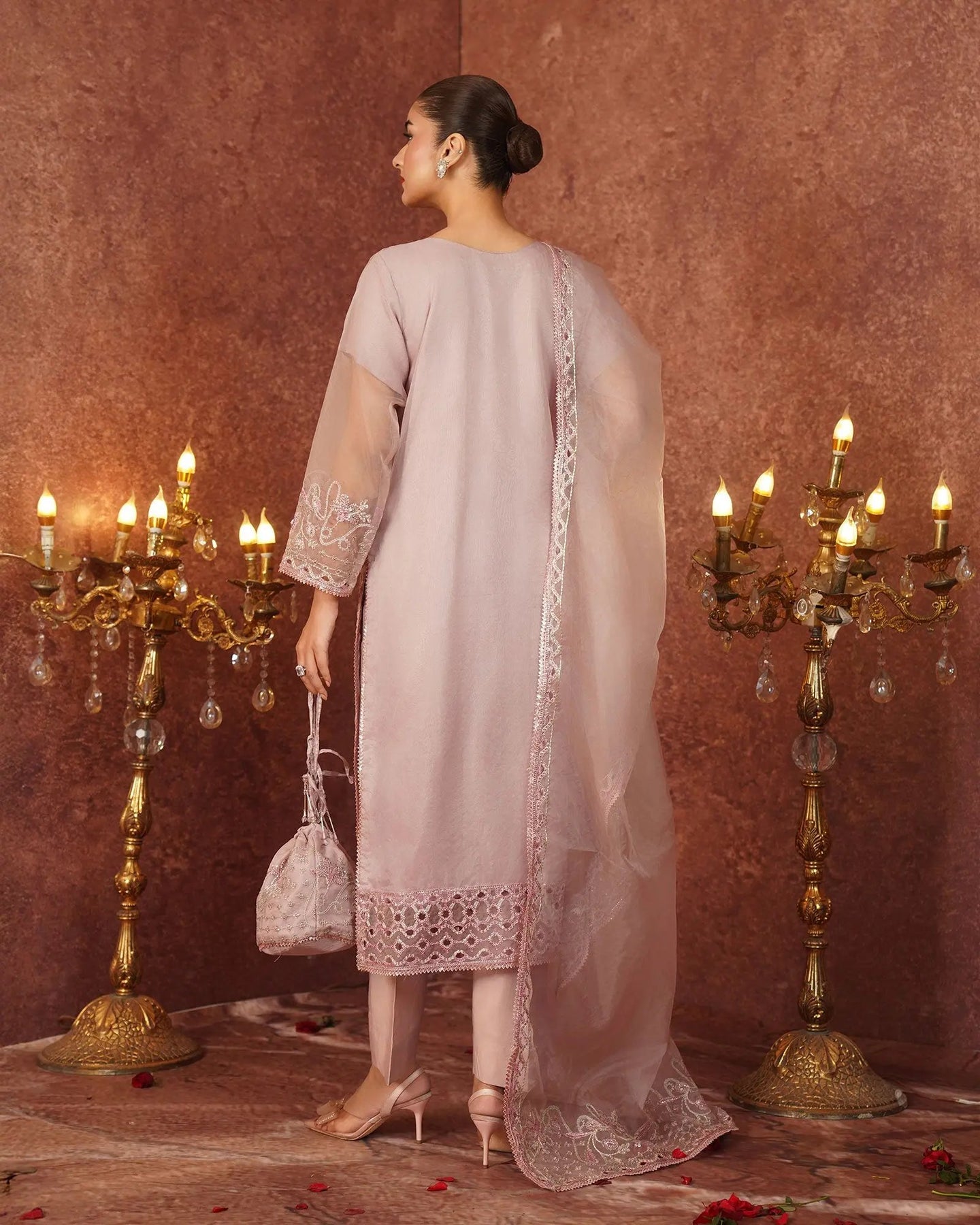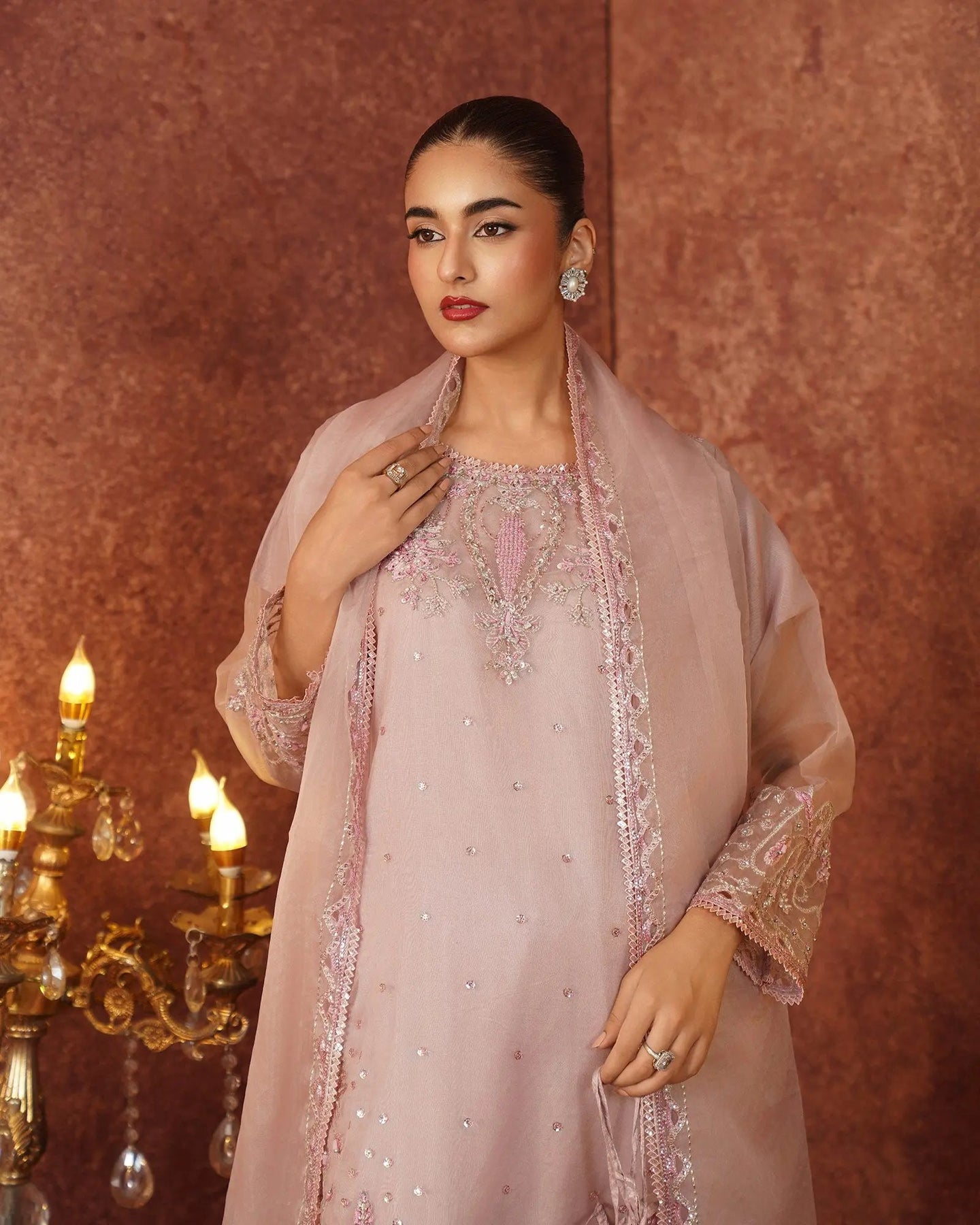 This simple but elegant attire brings a new look to your wardrobe. A classy kameez adorned with tilla, embroidery, sequins, beads, and lace added extra beauty with cutwork finishings paired with tailored trousers and a tissue dupatta with border finishings. giving a complete look.