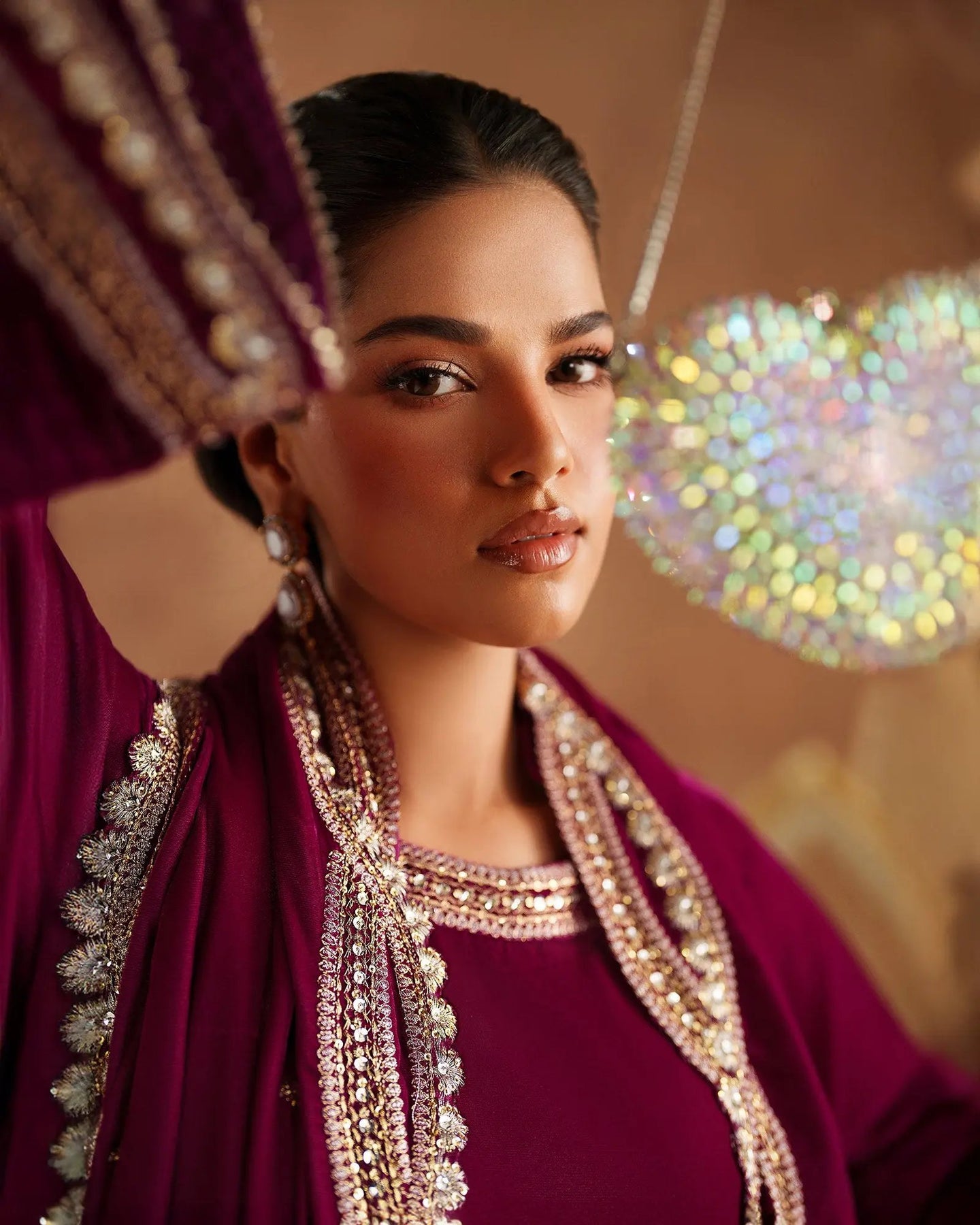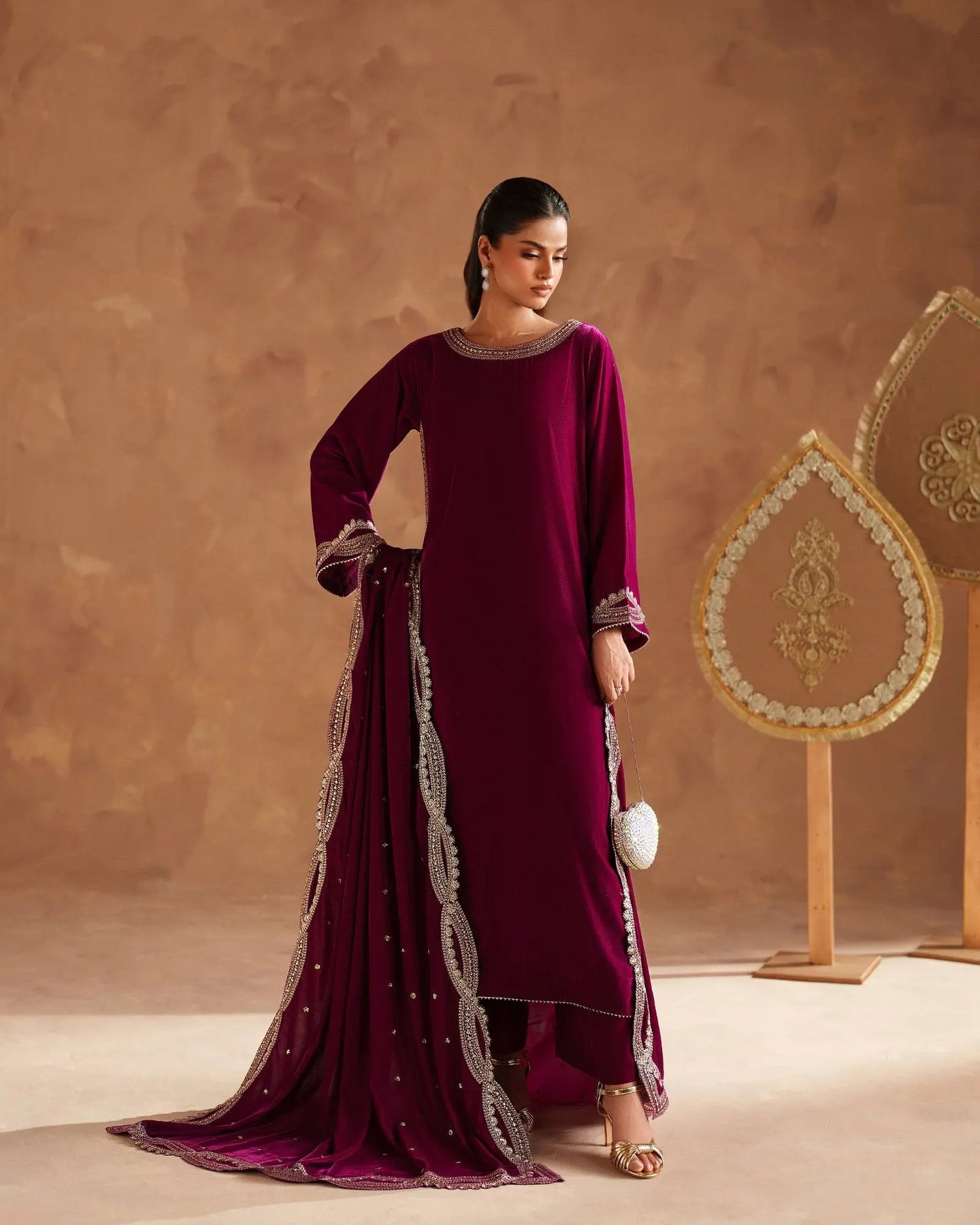 Slay in the epitome of style in this 3-piece velvet attire, featuring a long shirt adorned with lace detailing, paired with a velvet shawl with border details, and trousers, giving a complete pleasing look.