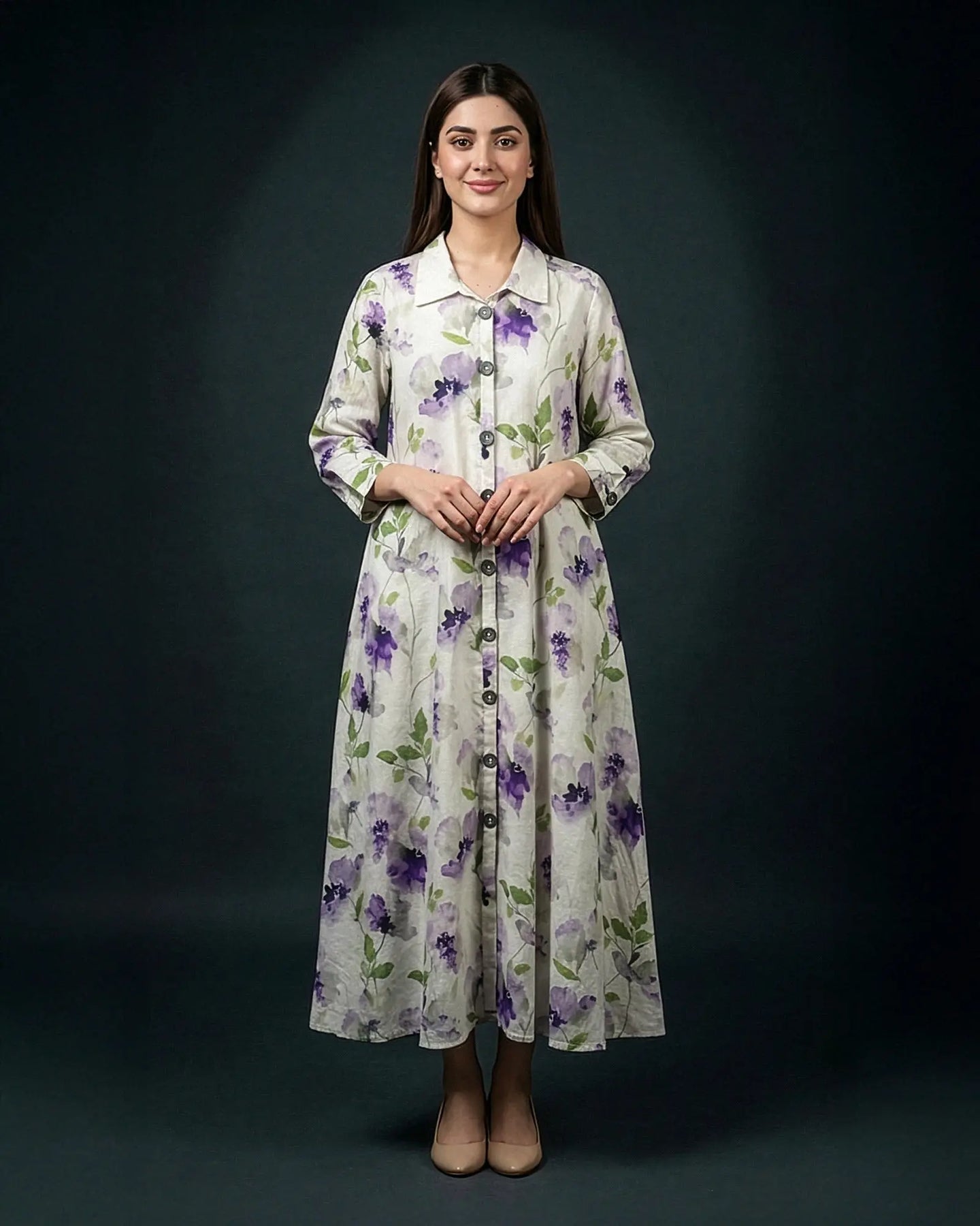 Step into summer-ready elegance with this printed frock, where playful designs and lightweight comfort come together for daytime celebrations and laid-back looks.
