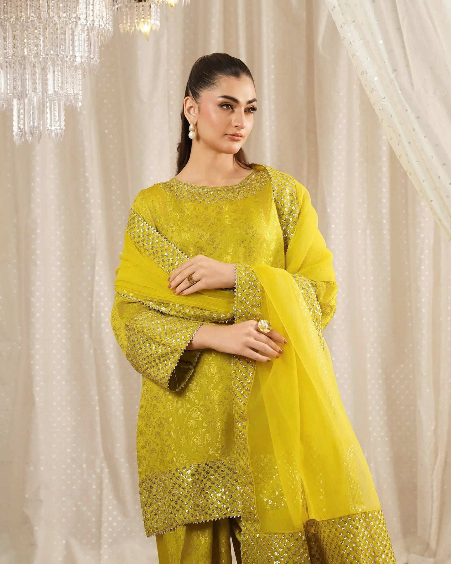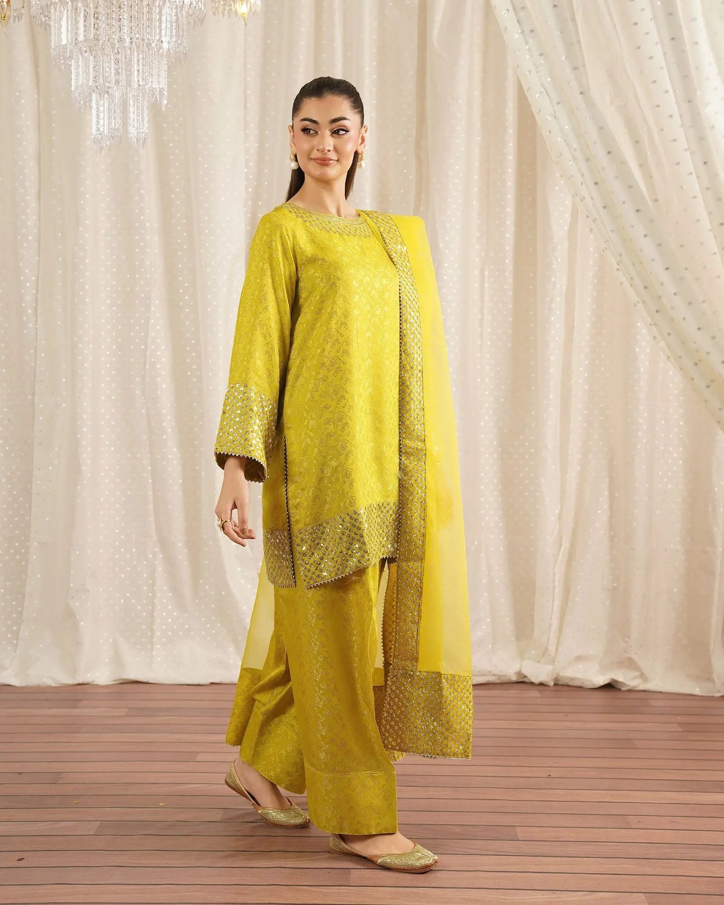 A perfect blend of tradition and modern finesse, this jacquard viscose 3-piece boasts a trendy shirt with a boat neckline and beautifully detailed sleeves. The embellished border, enhanced with sequins and lace, brings a touch of luxe artistry. With tailored trousers and a bordered dupatta, this ensemble makes an unforgettable impression.