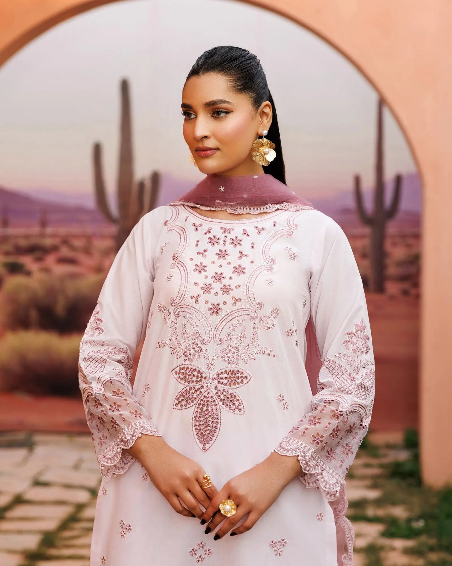 A vision of festive grace, this luxury pret ensemble in cambric cotton highlights a flowing shirt detailed with chikankari, lace, and organza appliqué. Paired with tailored culottes and a delicate net dupatta, it radiates refined charm.