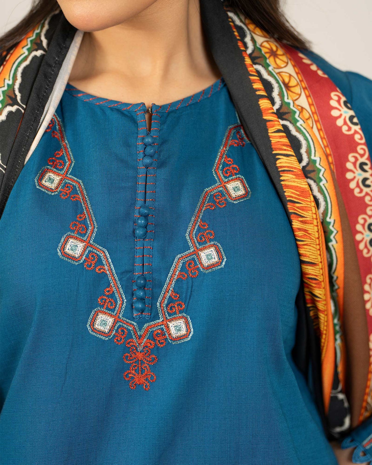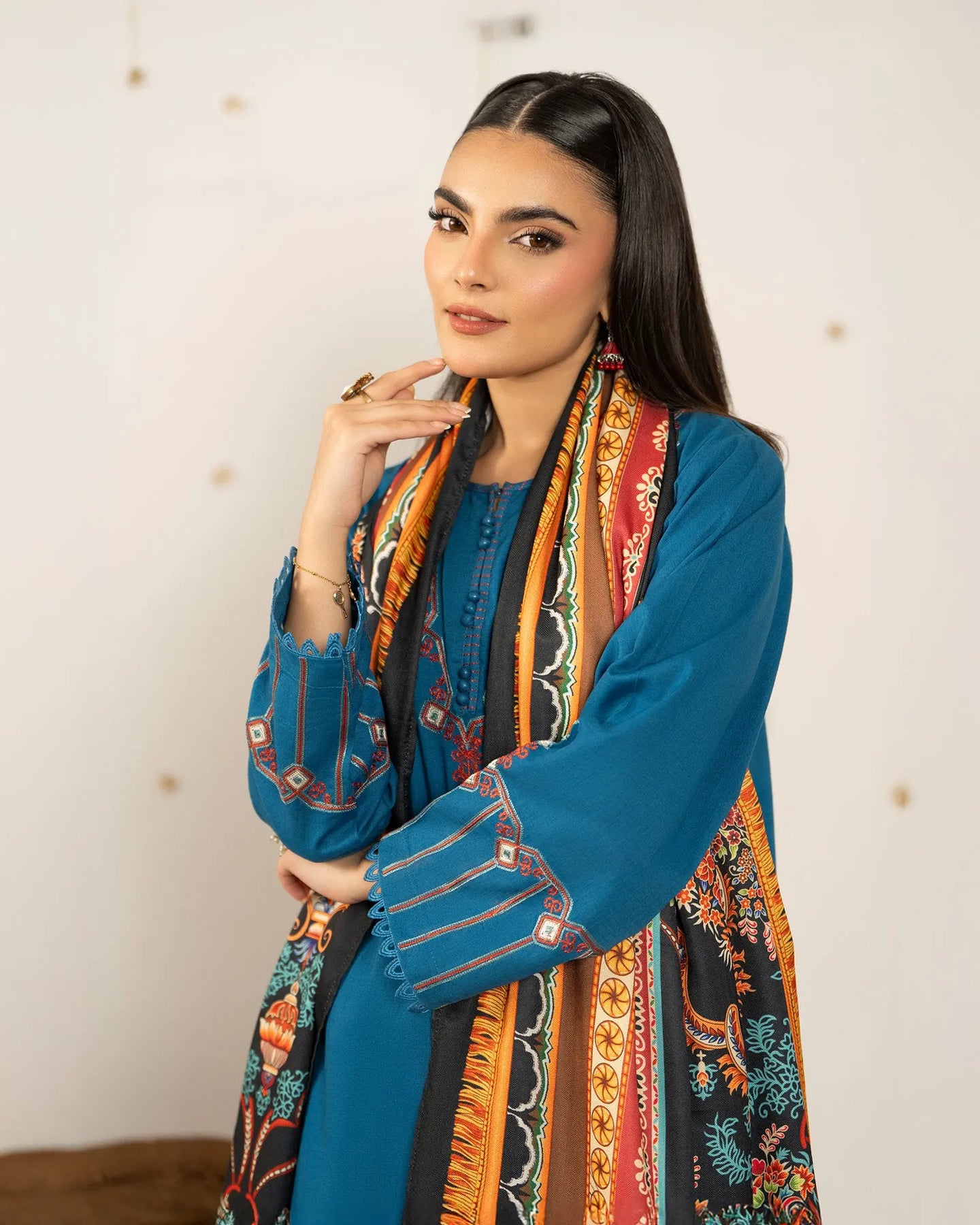 Welcome the season in style with this printed cross-slub khaddar 3-piece. The printed shirt is elevated with delicate all-over embroidery, border accents, and lace finishings. Paired with classic trousers and a statement printed shawl, it offers warmth, comfort, and effortless winter charm.
