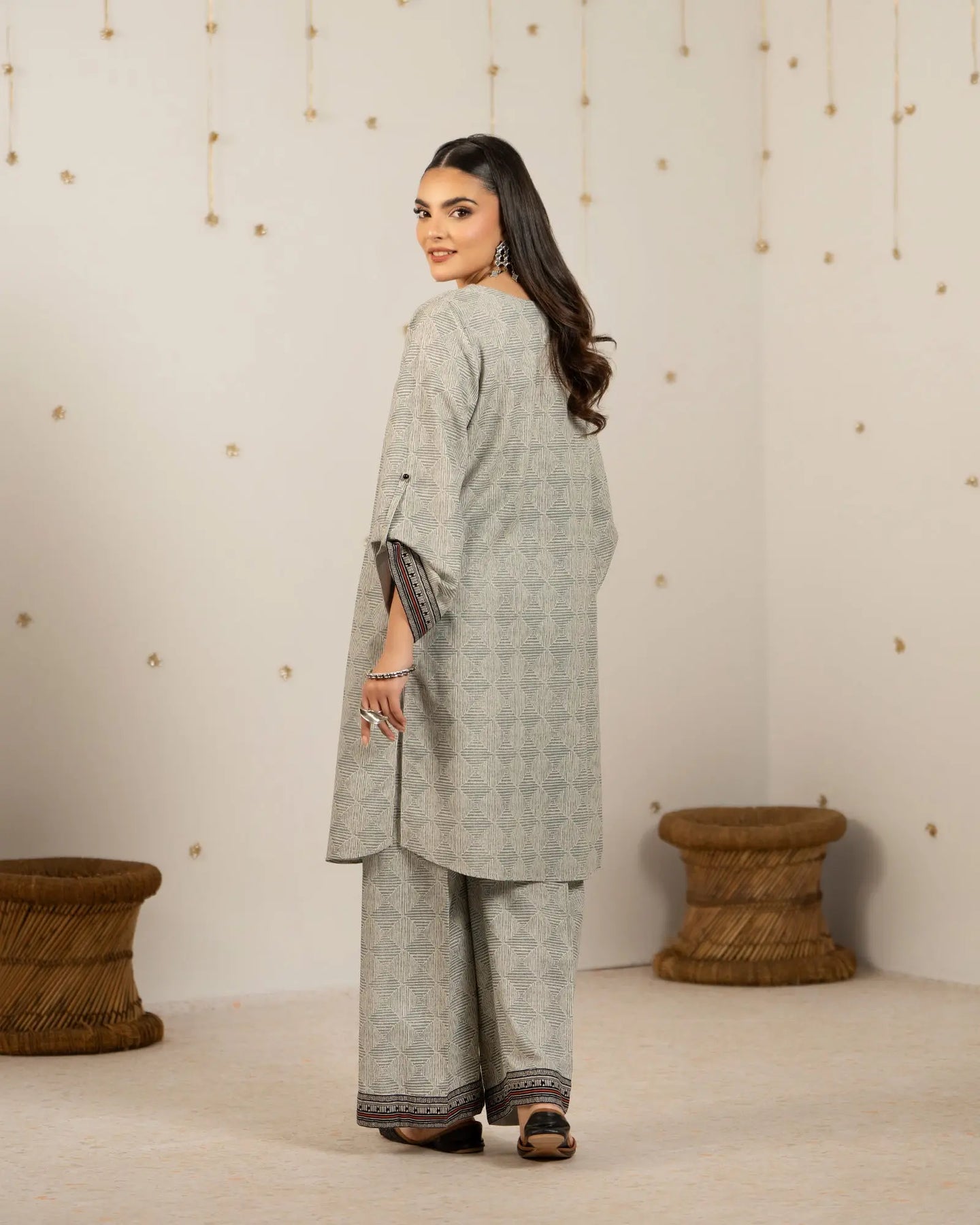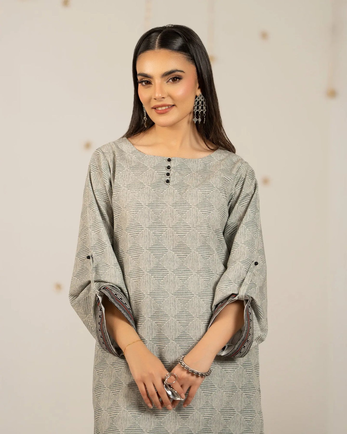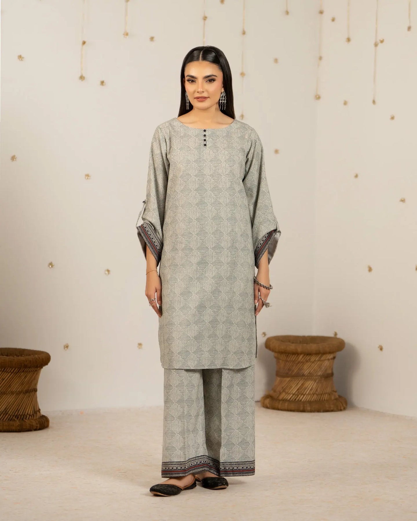 A perfect blend of comfort and sophistication, this khaddar 2-piece showcases a printed shirt with refined lace detailing, paired with trousers for a graceful and season-ready outfit.