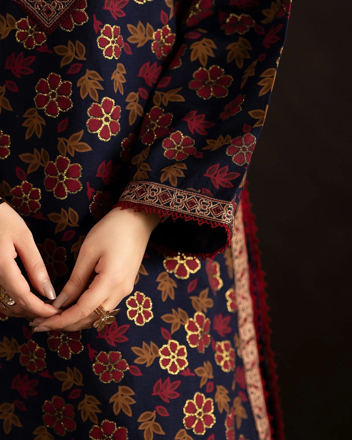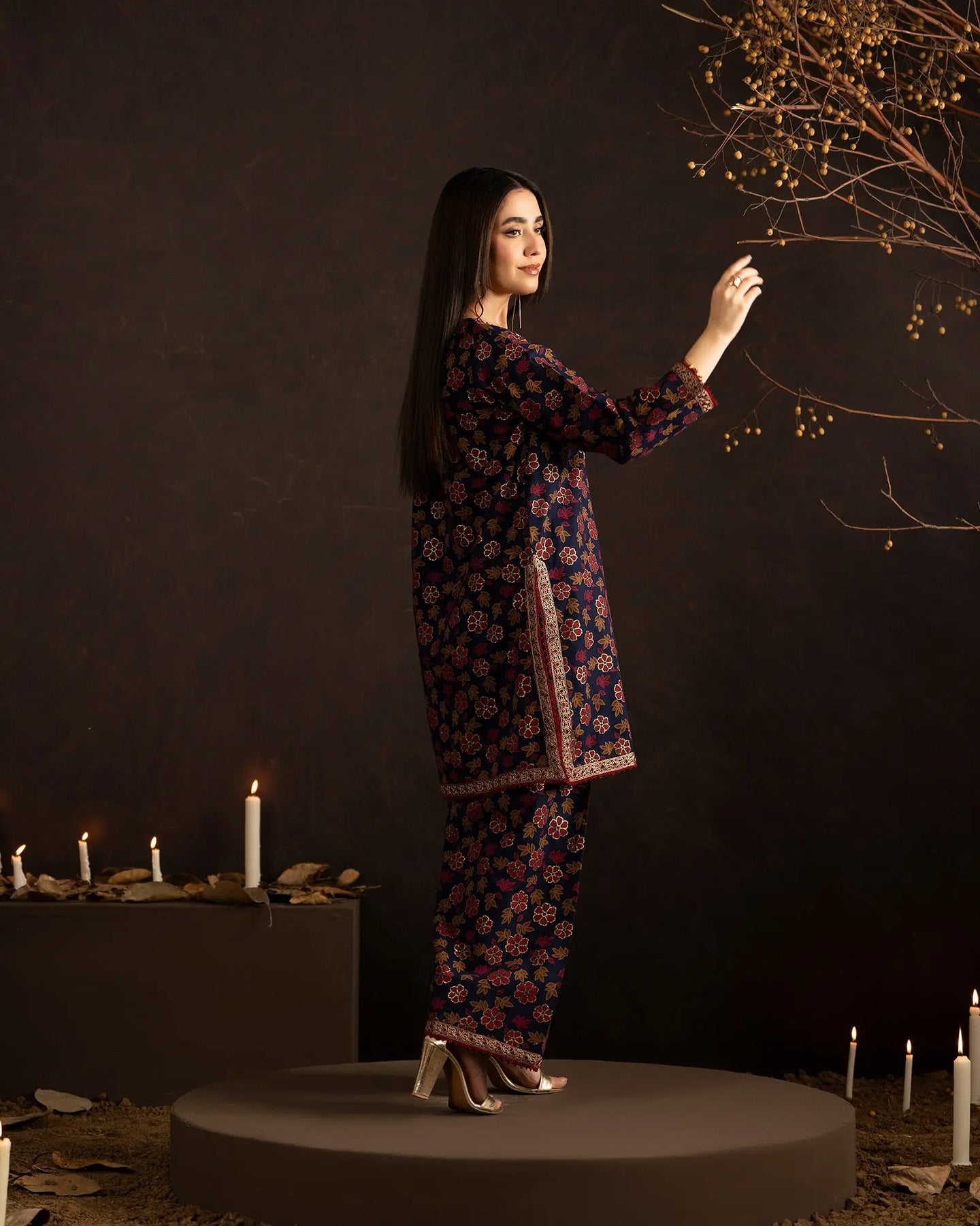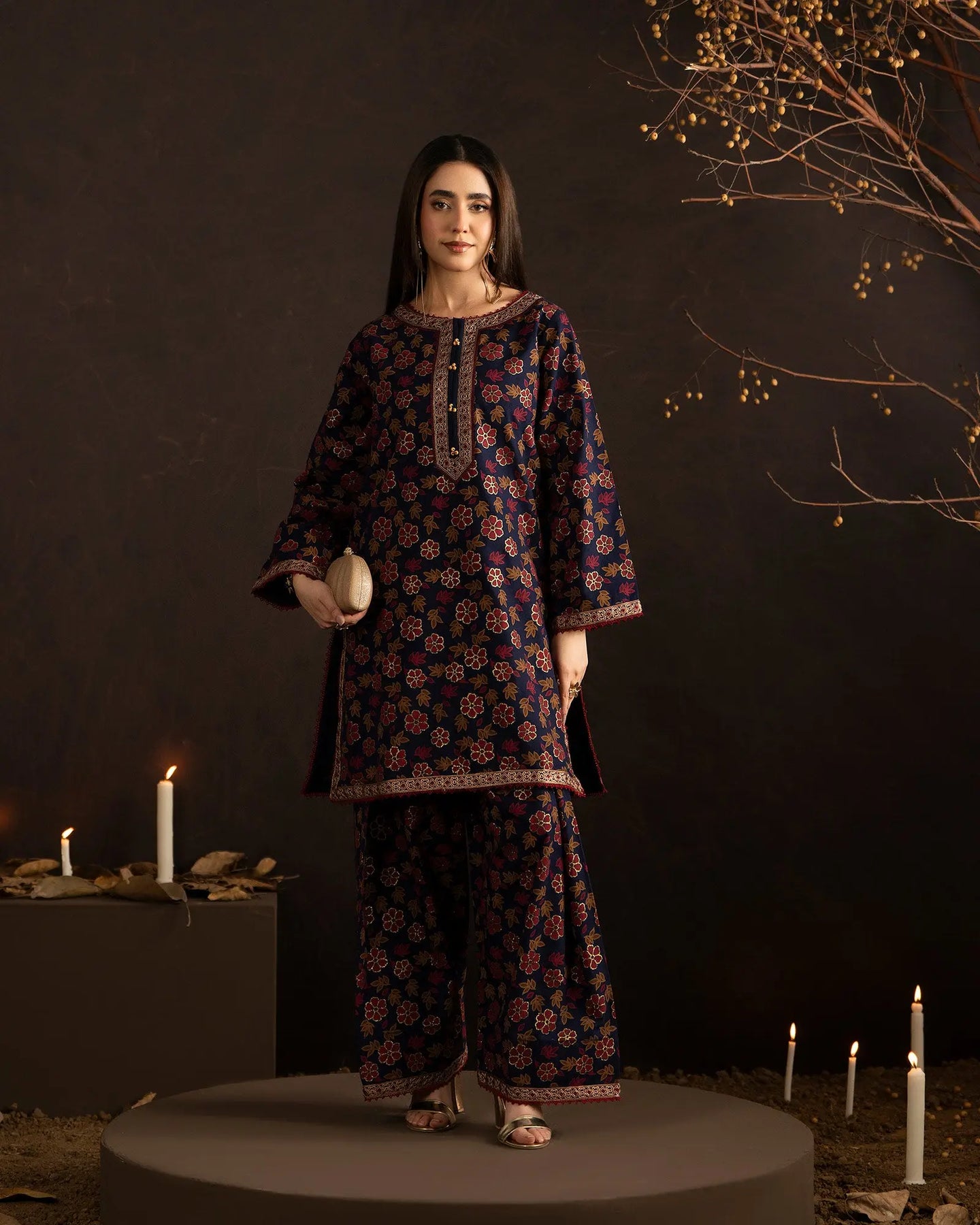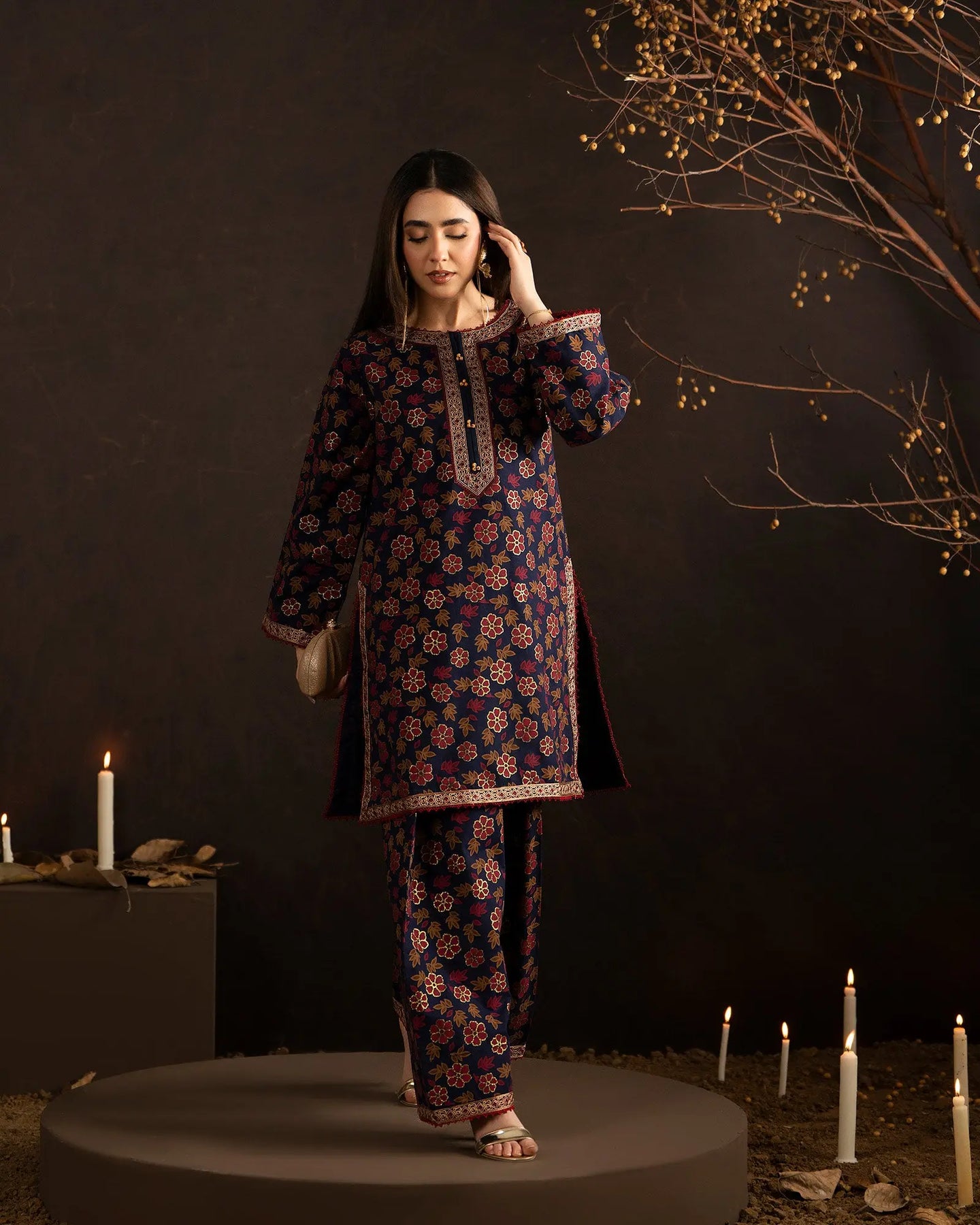 A perfect blend of comfort and sophistication, this khaddar 2-piece showcases a printed shirt with refined lace detailing and block-printed motifs, paired with trousers for a graceful and season-ready outfit.