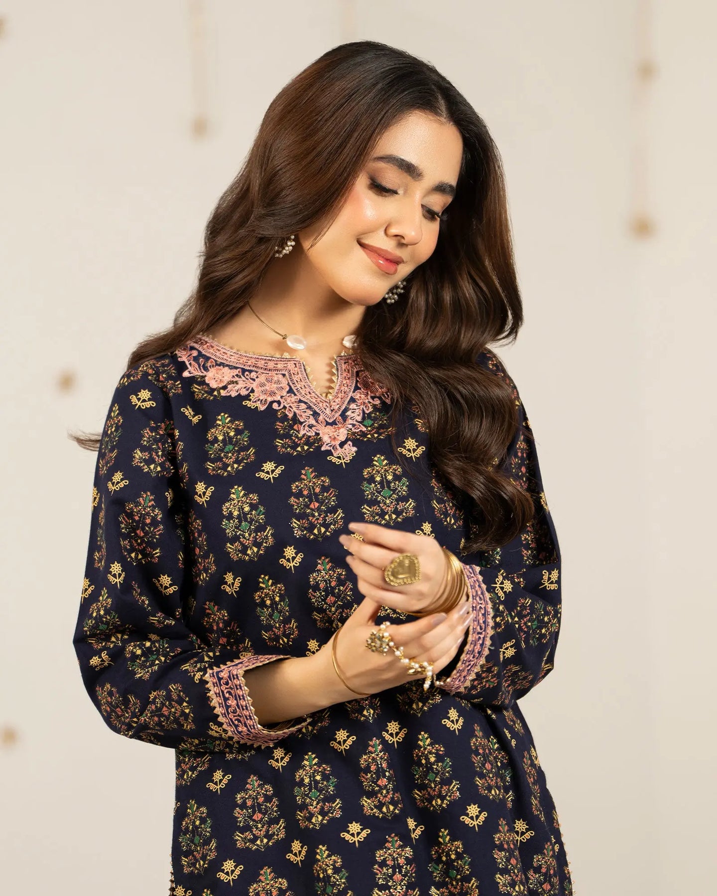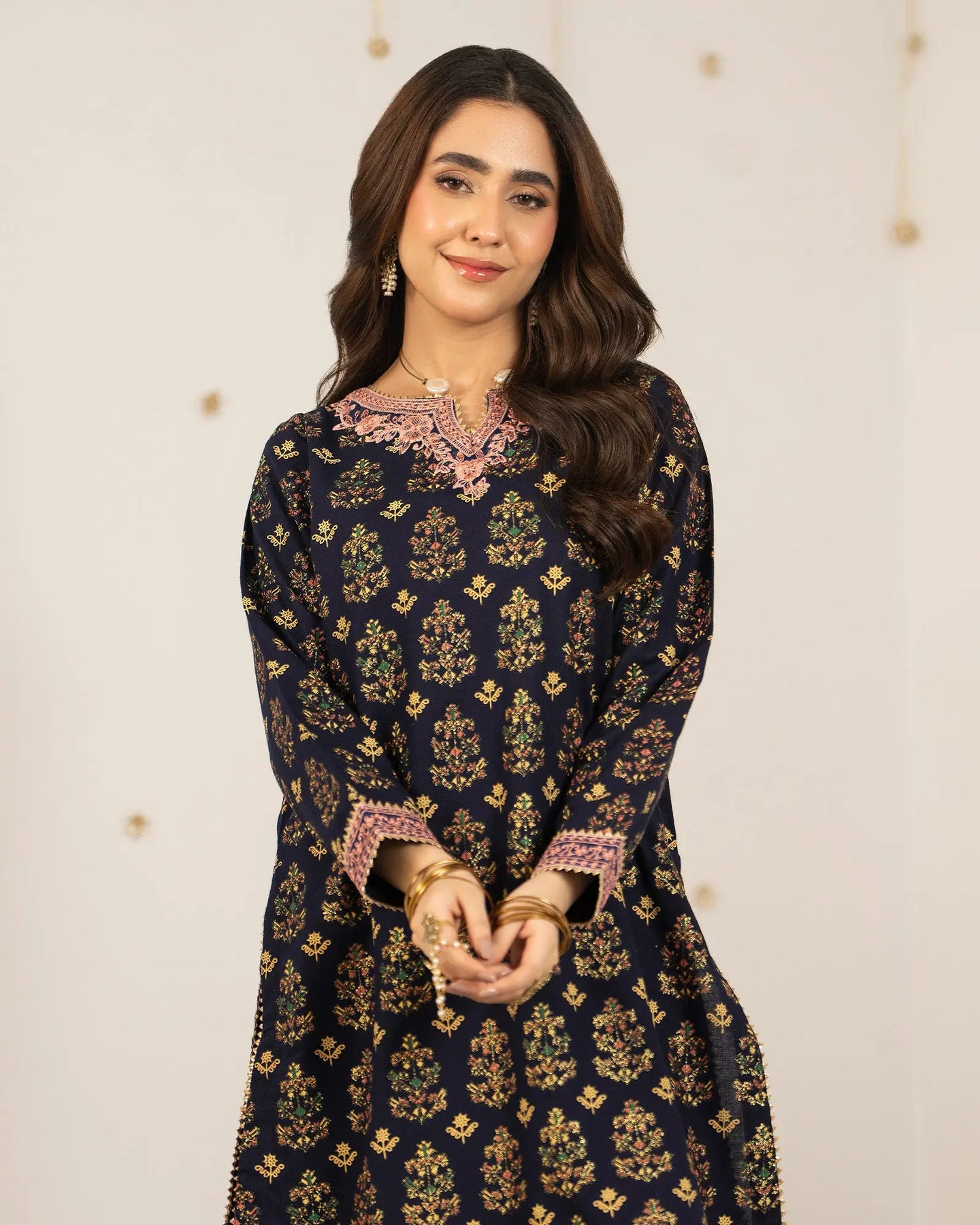 Blending comfort with understated elegance, this khaddar 2-piece features a beautifully printed shirt accented with delicate lace detailing and block-printed patterns, paired with trousers for a polished seasonal look.