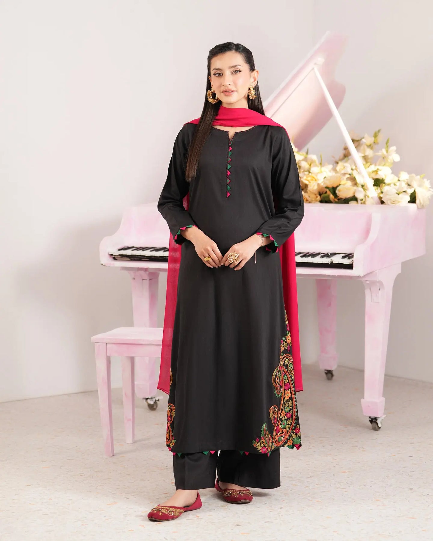 Style this season with this opulent embroidered piece that comes with a long shirt with colorful embroidery on a solid base paired with culottes, topped with a crinkle chiffon dupatta with dangling tassels on the corners, giving this attire a mesmerizing look all season long.