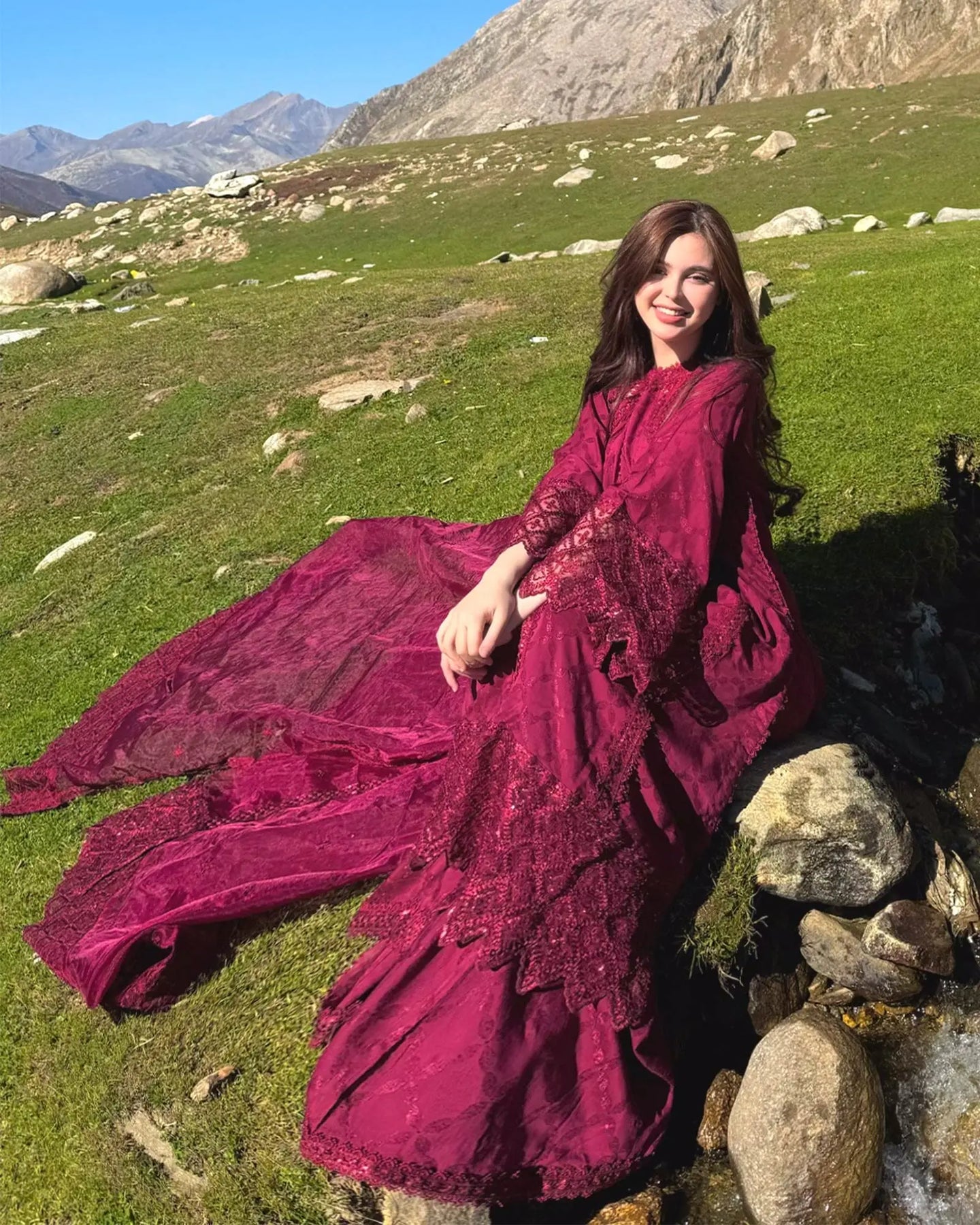 Slay in this bold attire that's a true addition to your festive wardrobe. It comes in a long, open, gown-style shirt with an embroidered base with lace with side cuts on the neckline , borders and buttonholes, and matching buttons. finishings, paired with a sharara and topped with an organza dupatta with lace, giving a complete pleasing look.