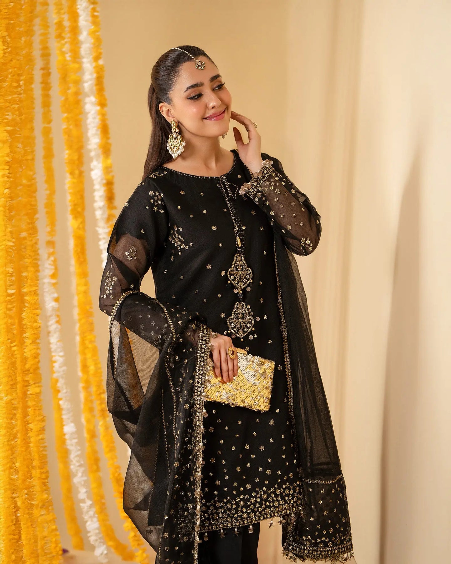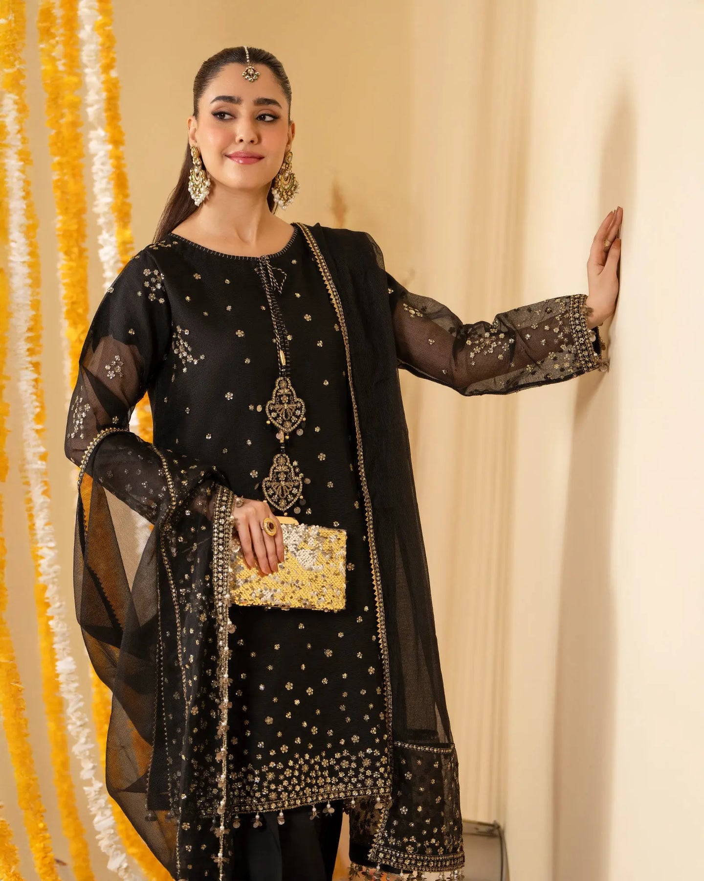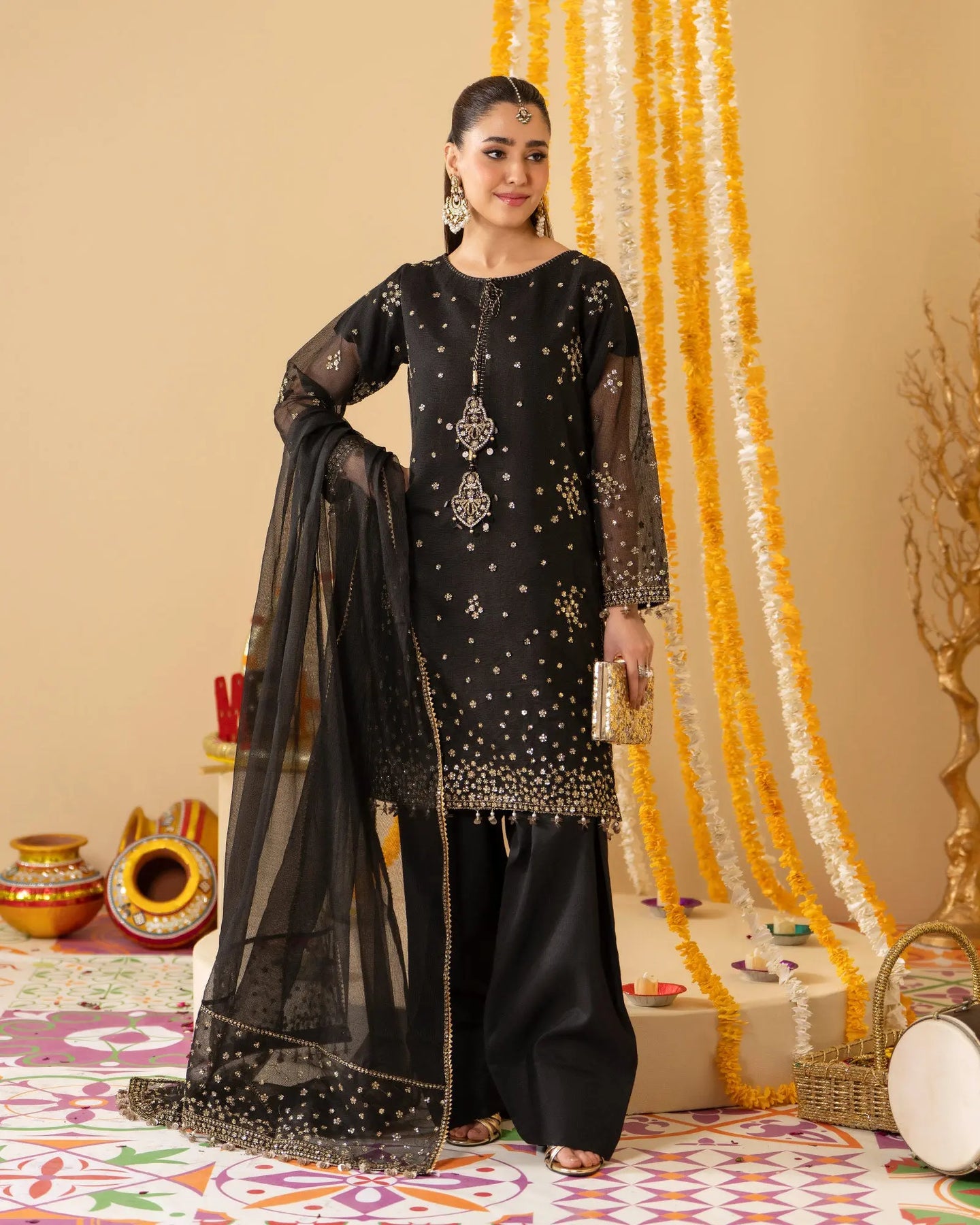 This simple but elegant attire brings a new look to your wardrobe. A classy kameez adorned with tilla, embroidery, sequins, and hangings on sleeves and hem added extra beauty with neckline tassels and finishings paired with farshi shalwar and bori net dupatta with border finishings.