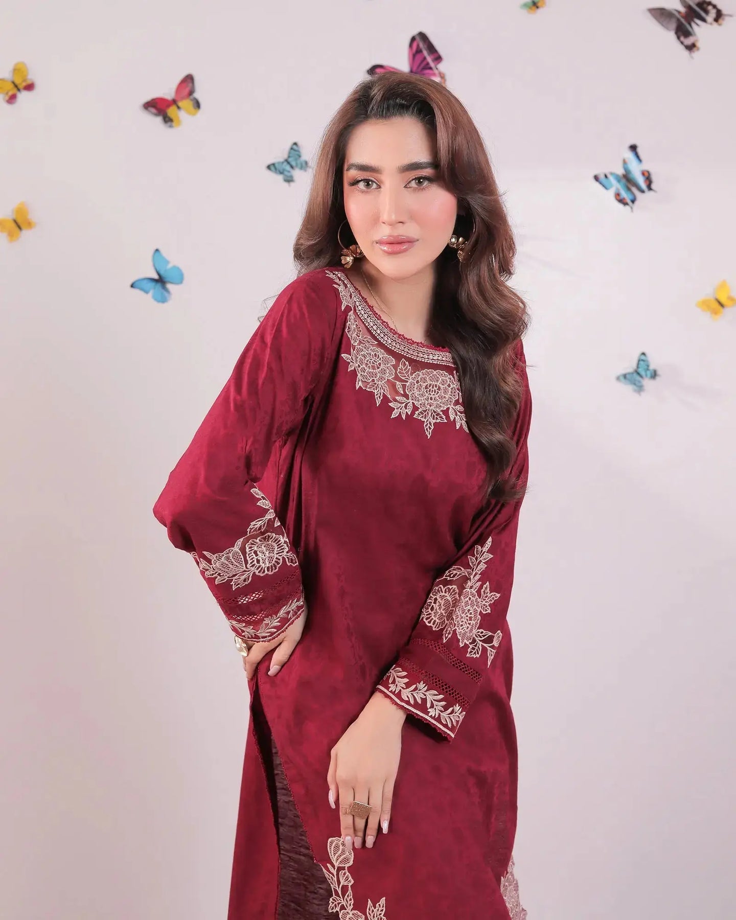 Be bold and stylish in this jacquard cotton 2-piece set. Featuring a long shirt with contrasting fine machine embroidery, appliqué, and cutwork details paired with matching culottes gives a fine, pleasing look.